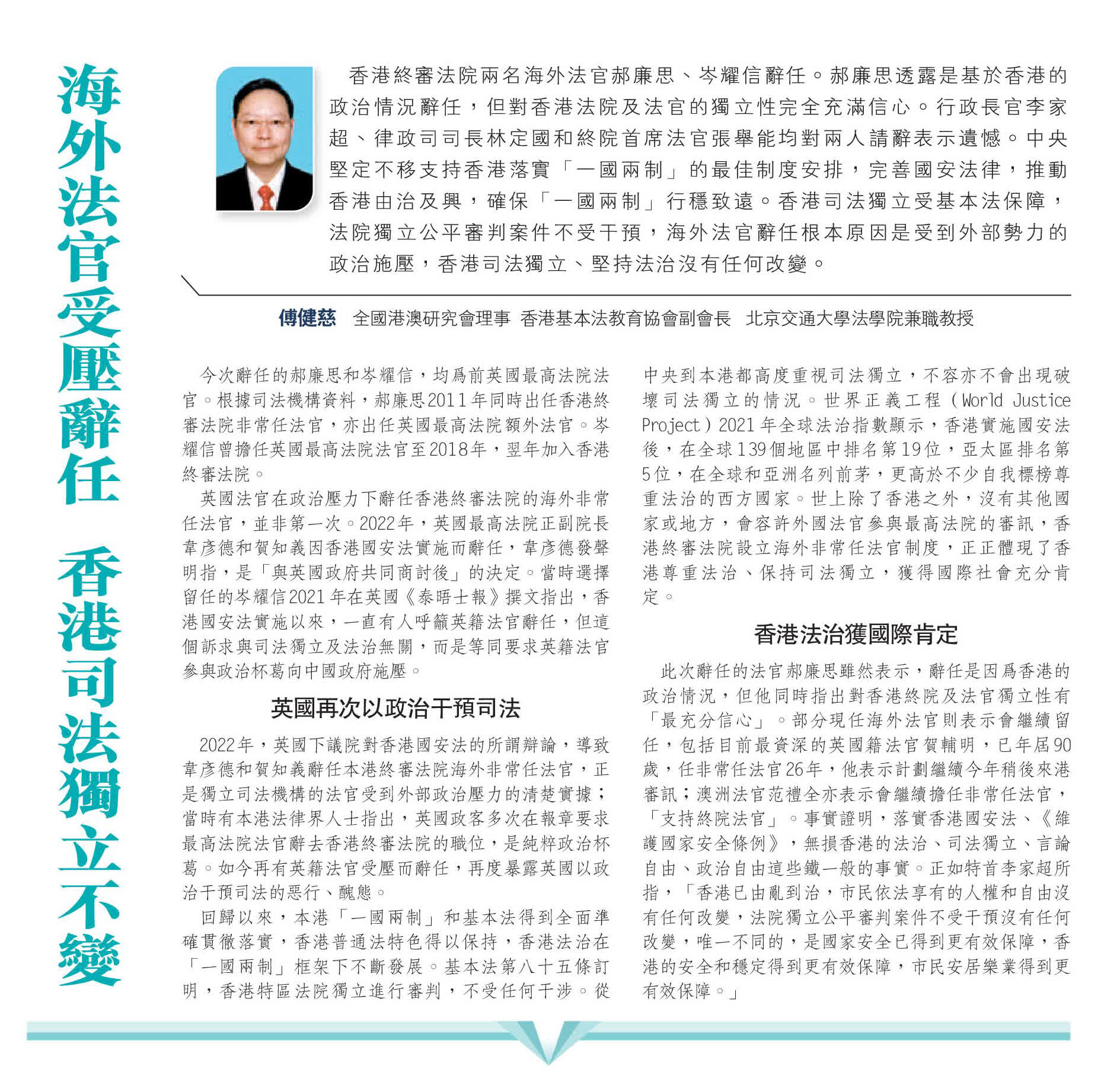 回歸以來,本港「一國兩制」和基本法得到全面準確貫徹落實,香港普通法特色得以保持,香港法治在「一國兩制」框架下不斷發展。基本法第八十五條訂明,香港特區法院獨立進行審判,不受任何干涉。從中央到本港都高度重視司法獨立,不容亦不會出現破壞司法獨立的情況。世界正義工程(World Justice Project)2021年全球法治指數顯示,香港實施國安法後,在全球139個地區中排名第19位,亞太區排名第5位,在全球和亞洲名列前茅,更高於不少自我標榜尊重法治的西方國家。世上除了香港之外,沒有其他國家或地方,會容許外國法官參與最高法院的審訊,香港終審法院設立海外非常任法官制度,正正體現了香港尊重法治、保持司法獨立,獲得國際社會充分肯定。