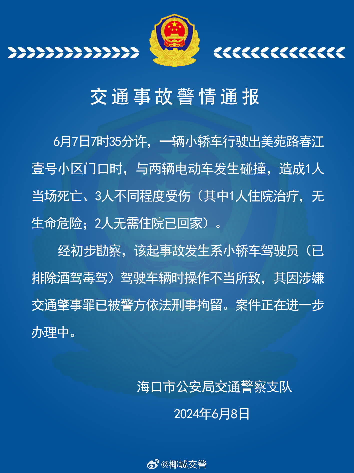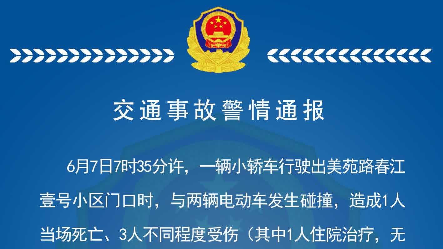 大公文匯網報道,6月8日,海口市公安局交通警察支隊發布警情通報稱,6月7日7時35分許,一輛小轎車行駛出美苑路春江壹號小區門口時,與兩輛電動車發生碰撞,造成1人當場死亡、3人不同程度受傷(其中1人住院治療,無生命危險,2人無需住院已回家)。