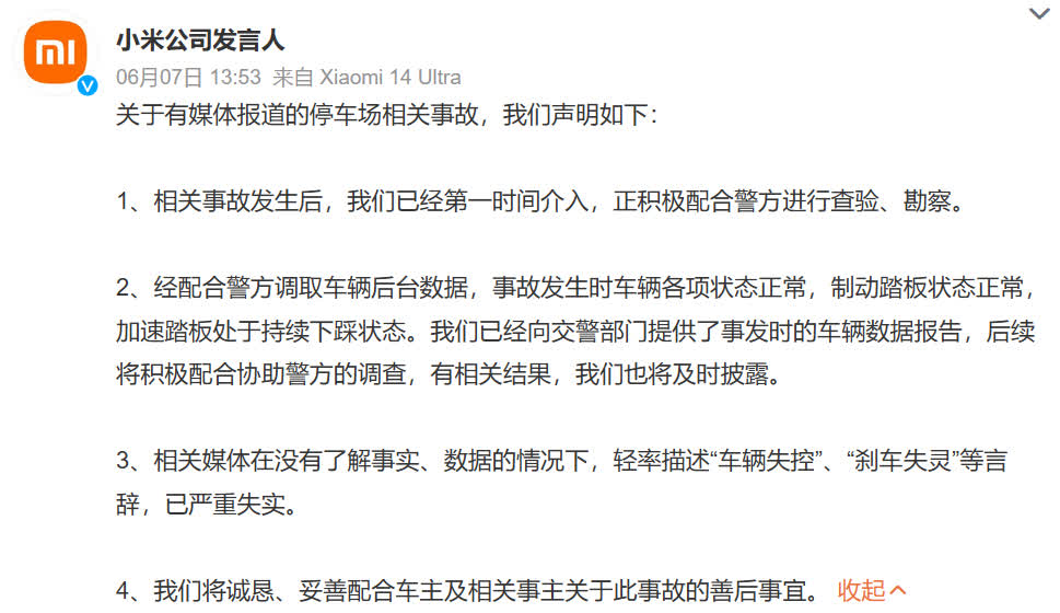 6月7日,一輛小米SU7在駛出海南海口一小區停車場時衝撞行人,致1死3傷引關注。當天下午,小米公司發言人在微博發布聲明表示,有媒體在報道時稱小米車輛失控、剎車失靈等,已嚴重失實。