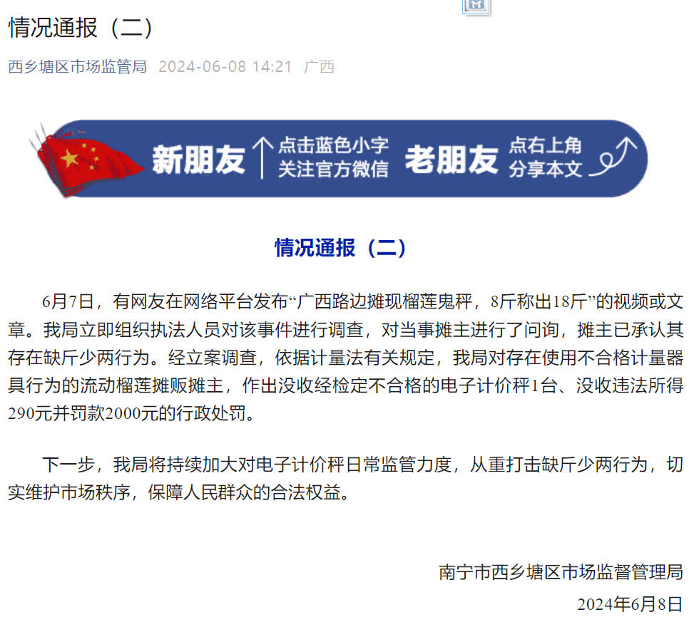 6月8日14時,廣西南寧市西鄉塘區市場監督管理局發布第二份情況通報稱,經立案調查,依據計量法有關規定,對存在使用不合格計量器具行為的流動榴槤攤販攤主,作出沒收經檢定不合格的電子計價秤1台、沒收違法所得290元並罰款2000元的行政處罰。