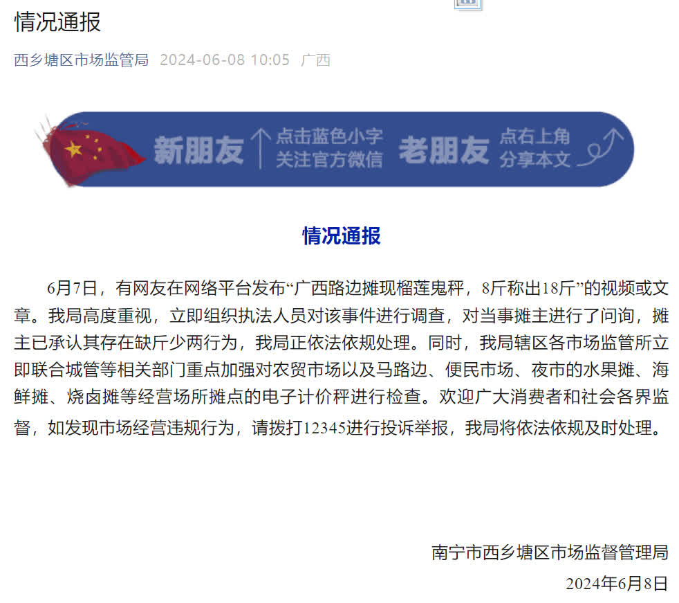 6月8日10時,廣西壯族自治區南寧市西鄉塘區市場監督管理局發布情況通報,稱針對網絡熱傳的「廣西路邊攤現榴槤鬼秤,8斤稱出18斤」事件,當地市場監管部門立即組織執法人員對該事件進行調查,對當事攤主進行了問詢,攤主已承認其存在缺斤少兩行為,該局正依法依規處理。