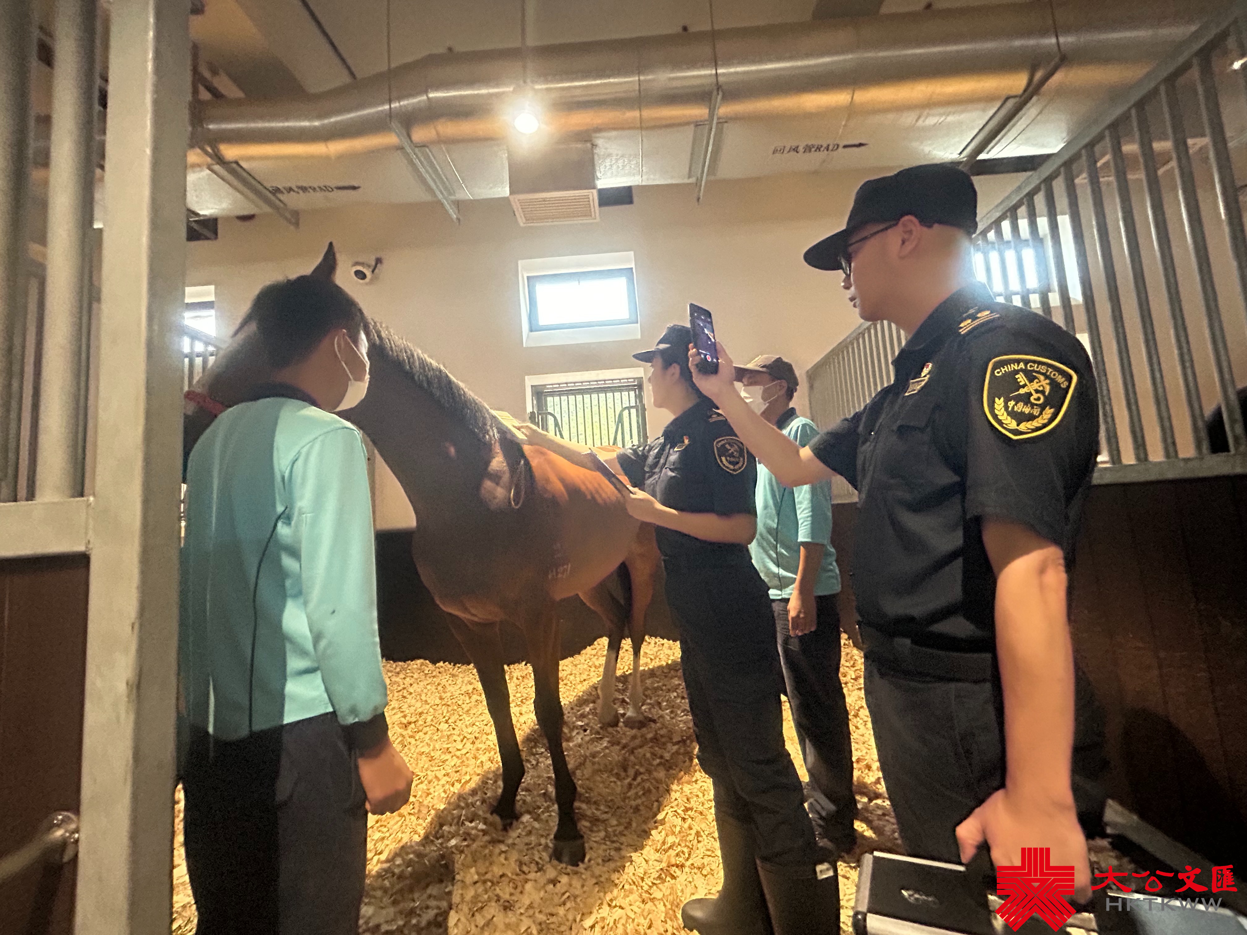 14時15分,三輛滿載馬匹的運馬車準時抵達從化馬場。在馴馬師「安撫」賽馬間隙,海關完成了各項人工查驗工作。在馬匹前往馬房的通道上,智能設備「無感」完成馬匹的測溫和芯片信息掃描,進出境監管高效完結。