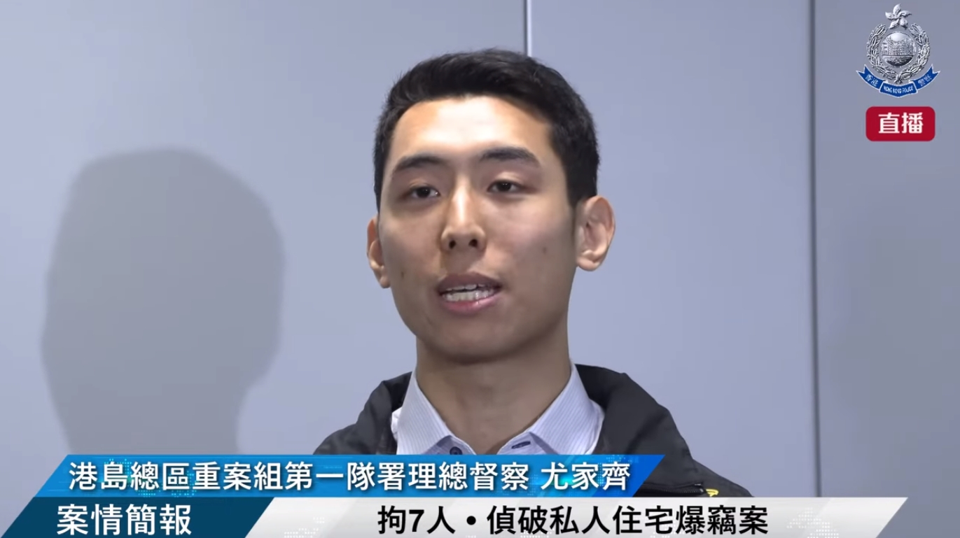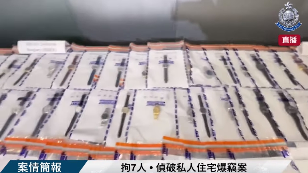 警方指,東區一棟私人住宅大廈有住戶本周三報案指單位被人爆竊,損失過百隻手錶、一批玉石首飾和3萬現金等,總損失約60萬元。警方翻查閉路電視後鎖定一個本地爆竊團夥,其中2名賊人於案發當日進入大廈單位後,再會合4名同黨,其中1人更相信是同一大廈住戶。警方同時搗破團夥用作收藏贓物的住宅和酒店單位,起回135隻手錶和30件玉石首飾,相信已起回所有贓物,所有被捕人士正被扣留調查。