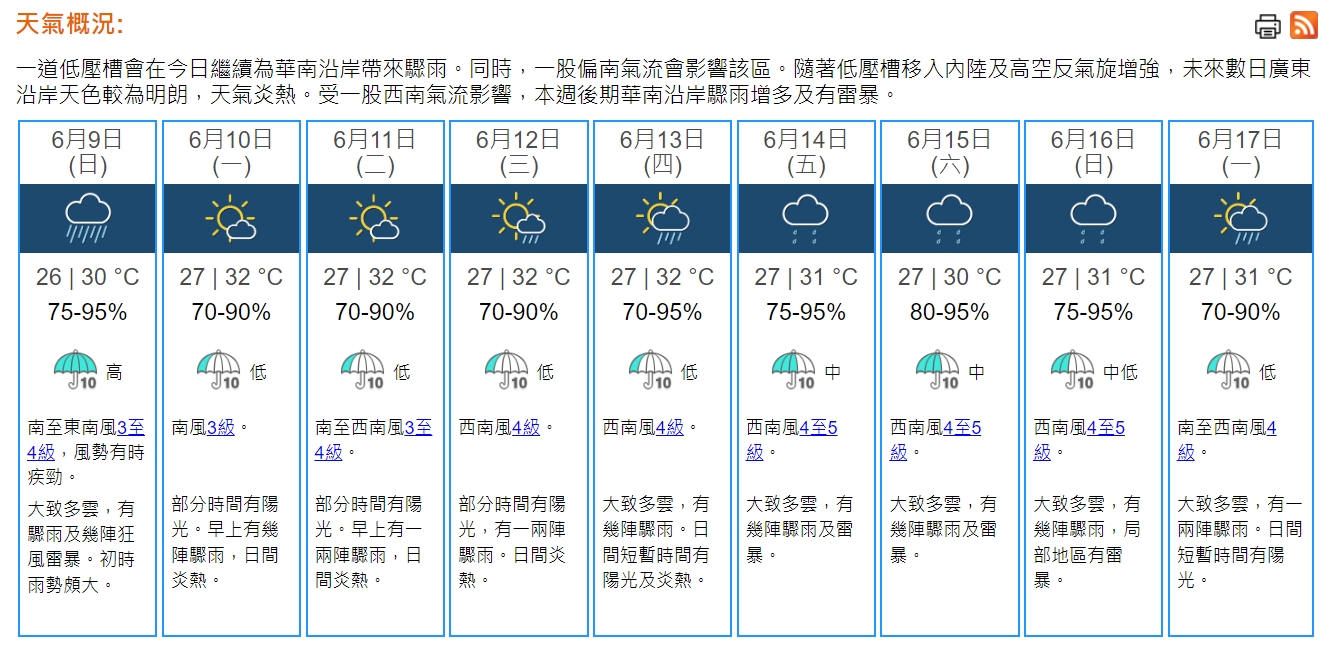 天文台預計本港今日天氣大致多雲,有驟雨及幾陣狂風雷暴。初時雨勢頗大。日間最高氣溫約30度。吹和緩南至東南風,風勢有時疾勁。展望端午節及隨後一兩日部分時間有陽光及炎熱,亦有幾陣驟雨。