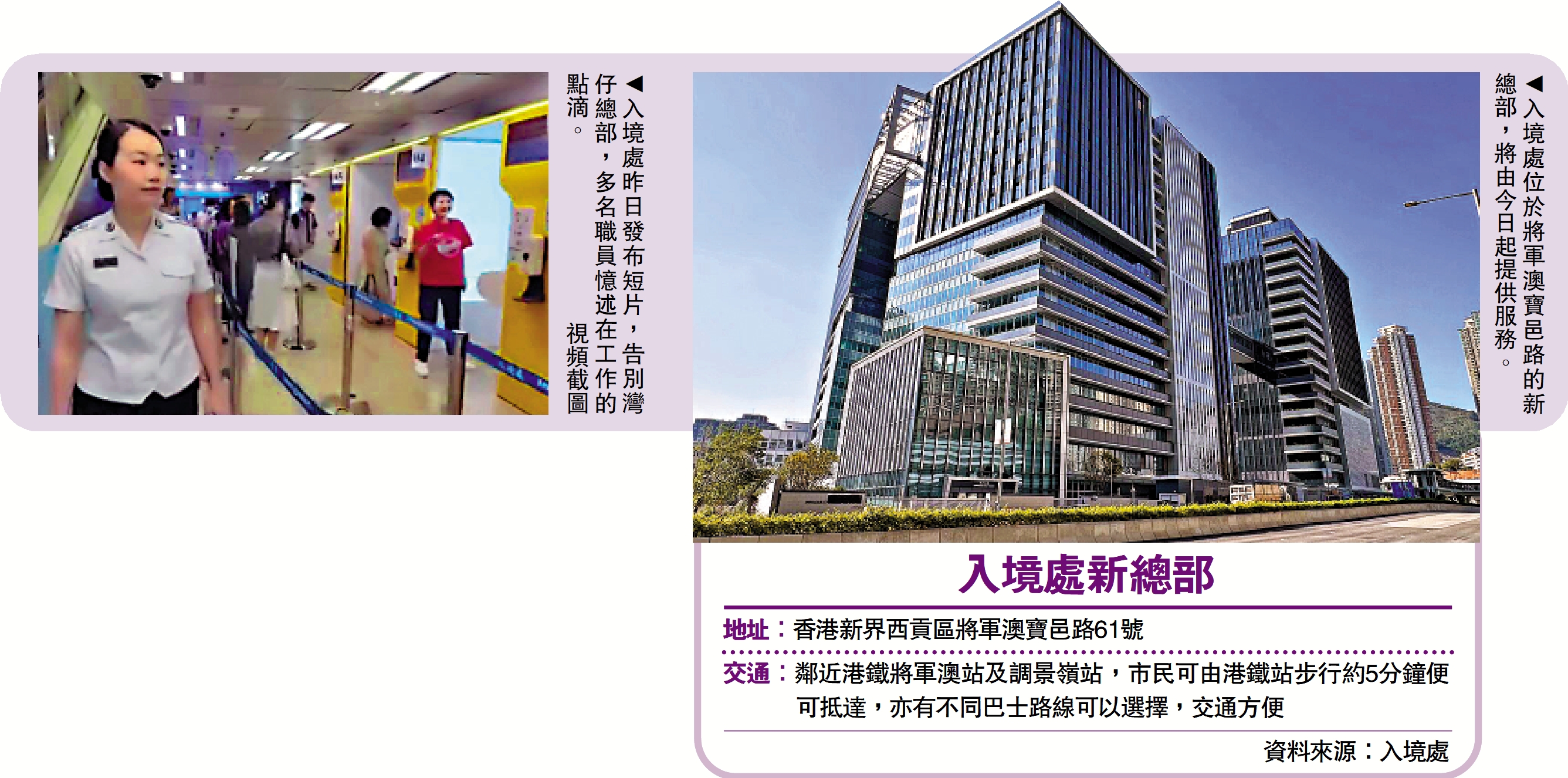 入境處昨日發布短片,告別灣仔總部,並指入境處總部將會在將軍澳繼續為市民提供最優質及貼心的服務。影片中,多名職員憶述在舊總部工作的點滴,分享對新總部的工作期望,強調即使地方變動,但不變的是服務市民的初心。