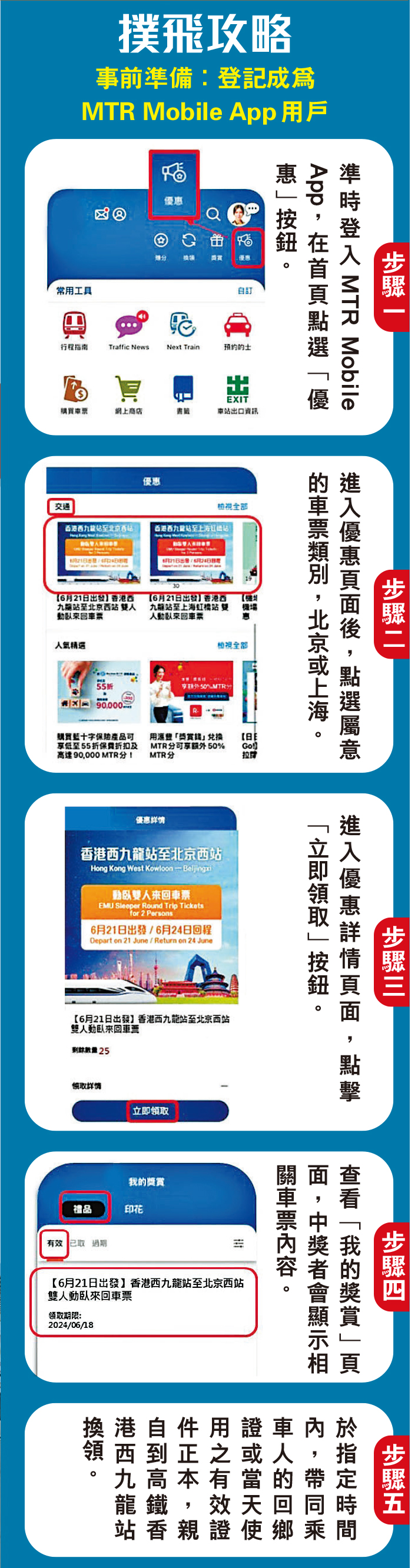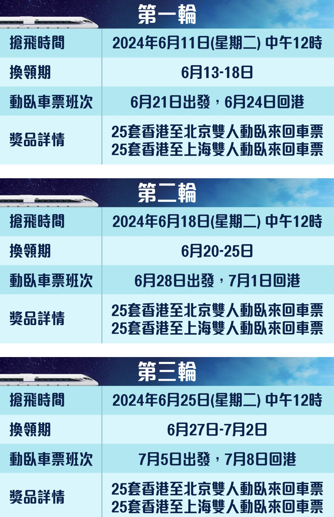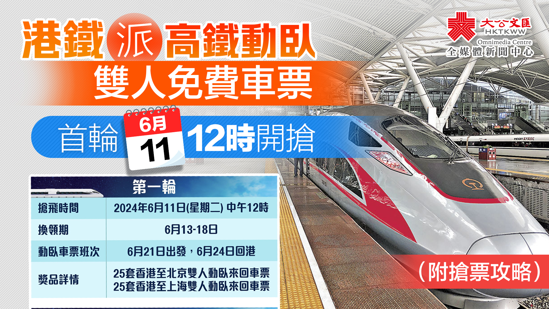 大公文匯全媒體報道,高鐵香港段往來北京及上海的高鐵動臥列車6月15日起開通。為慶祝高鐵香港段推出臥鋪列車,MTR Mobile App由6月11日(星期二)起,連續3個周二每周免費送出25套雙人來回香港—北京,及25套雙人來回香港—上海的高鐵動臥列車車票予MTR Mobile登記用戶(3輪總共派發150套免費雙人來回車票)。