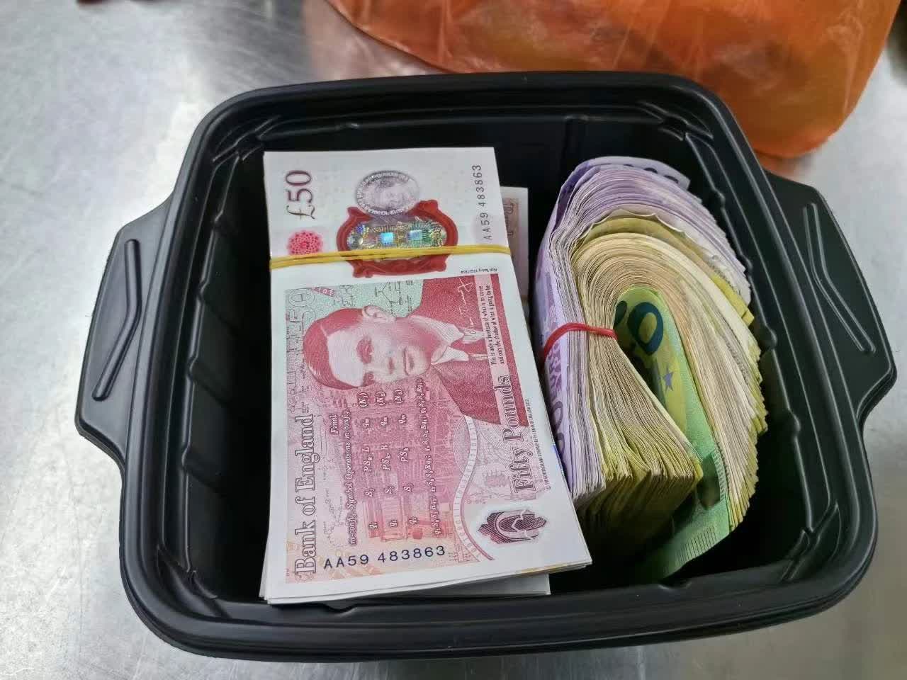 一名旅客經羅湖口岸旅檢出境大廳出境時,隨身背着一個小背包,未向海關申報,被該關關員抽查。經檢查,在該旅客攜帶的包裝完好、未開封的自熱小火鍋中查獲現金歐元和英鎊。經清點,合計4.6萬歐元、2.014萬英鎊,折合人民幣約54.5萬元。