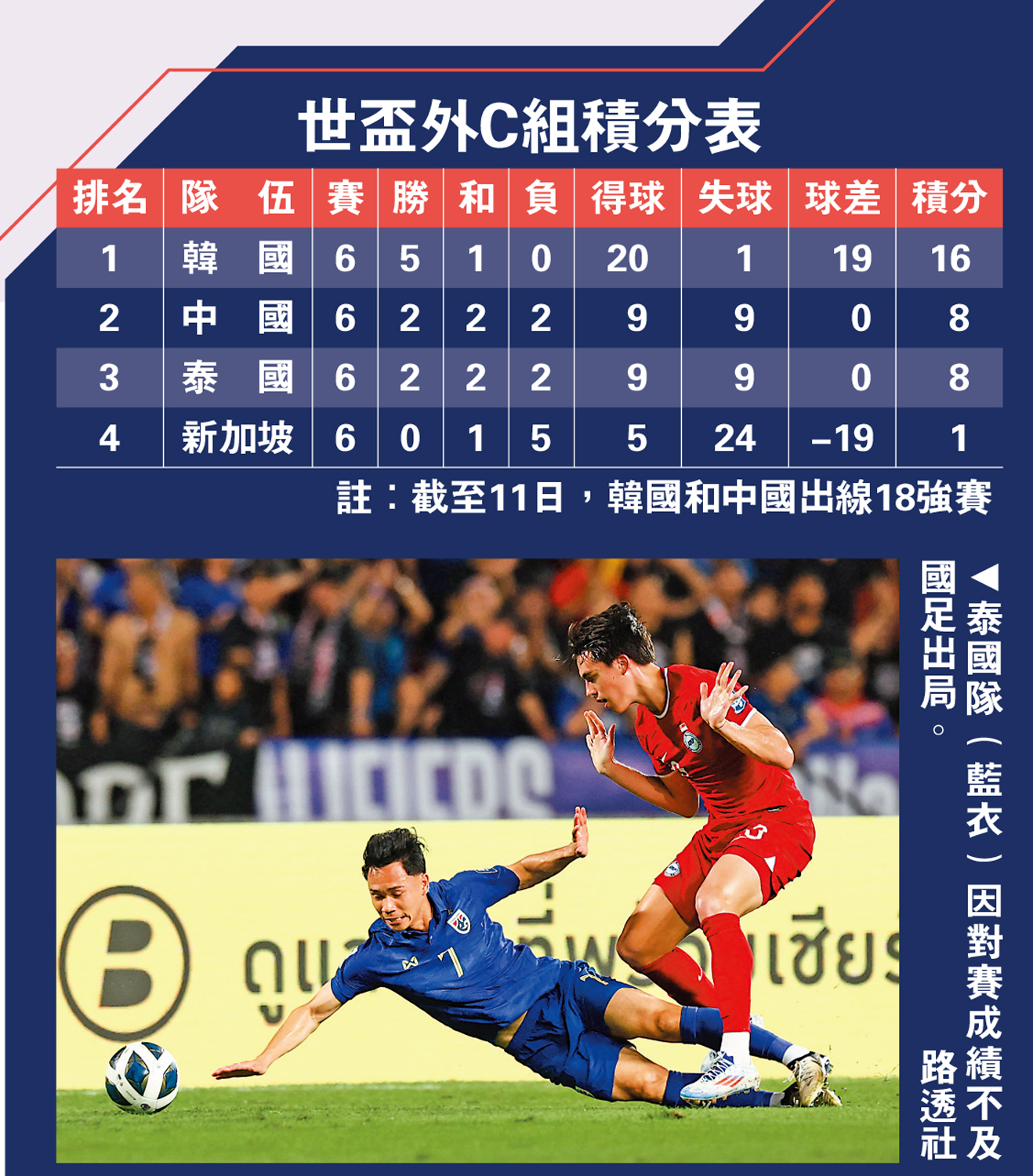 同組另一場賽事,泰國於主場對陣新加坡,必須要贏3球才能晉級的泰國,於上半場37分鐘取得一個入球領先1:0回更衣室。下半場,繼續進攻的泰國未能拉開比分,反被新加坡於57分鐘以一記精彩入球追成1:1。泰國於79及86分鐘入球贏3:1。賽後中國與泰國同得8分,雙方甚至得失球差及得球都一樣,中國以較佳對賽成績(1勝1和)壓倒泰國以小組次名出線。