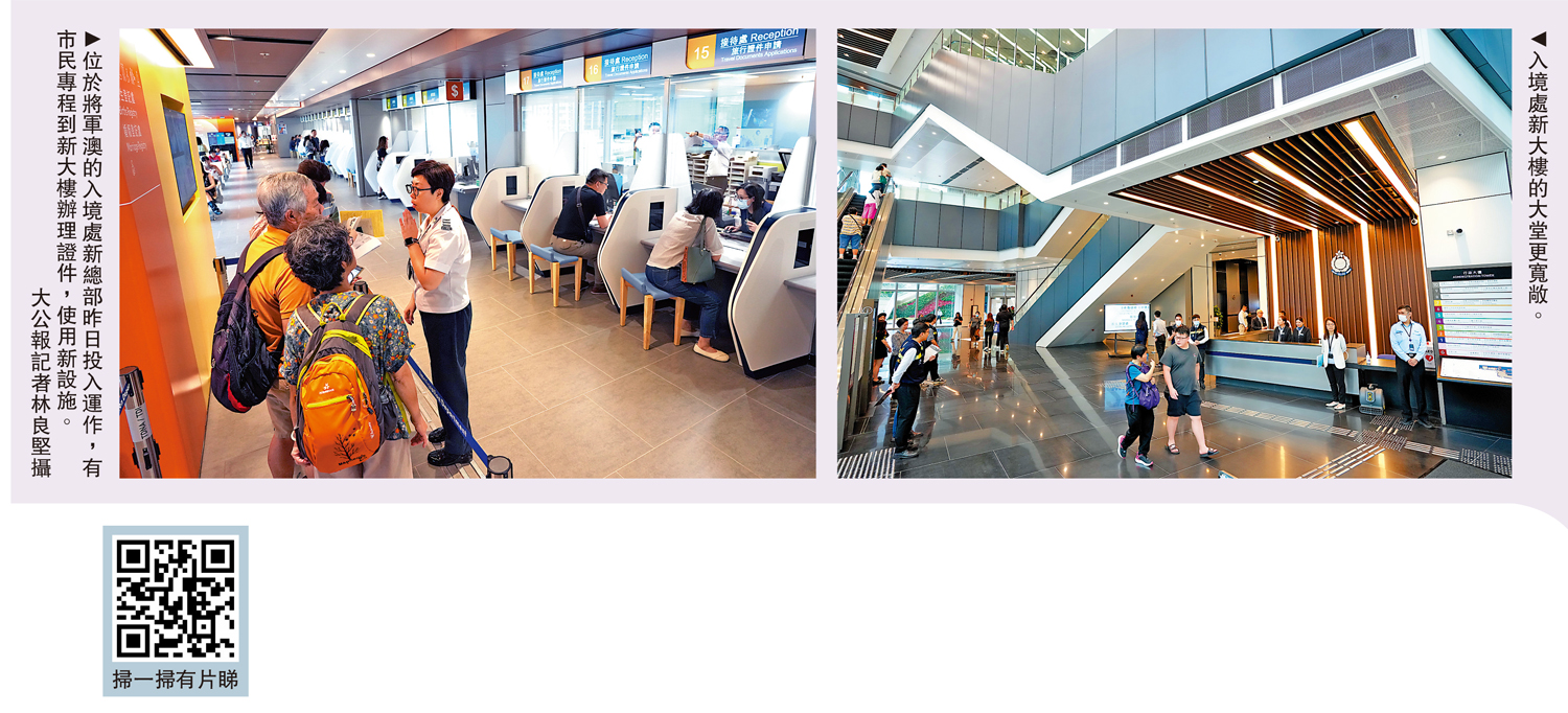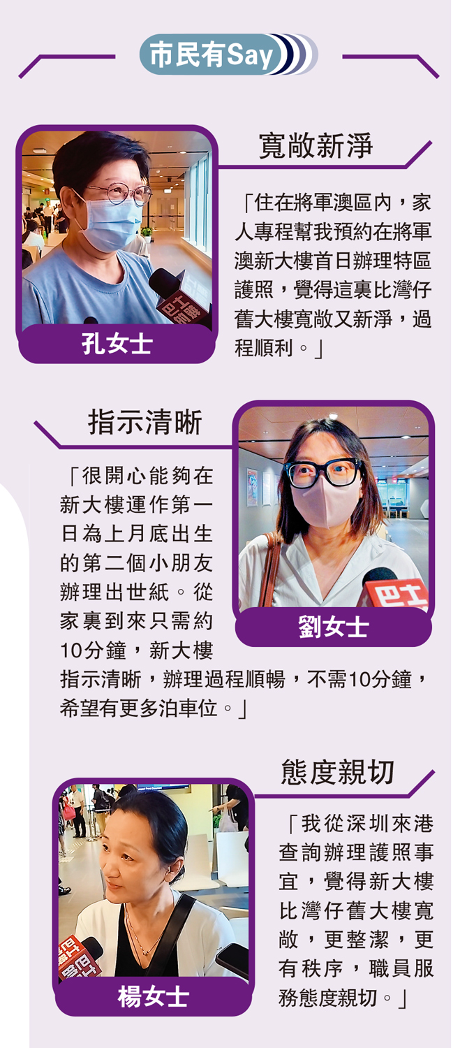 (大公報 記者 古倬勳)位於將軍澳的入境處新總部於昨日(11日)啟用。新大樓增設了婚姻登記及出生登記服務,並設有婚禮禮堂。入境處處長郭俊峯表示,截至早上10時,大約400人次使用服務,運作大致暢順,預計未來新總部服務人次與位於灣仔的舊大樓相若,有信心能為市民提供更好的服務。有市民專程在新大樓啟用首日到來辦理證件及出生登記。
