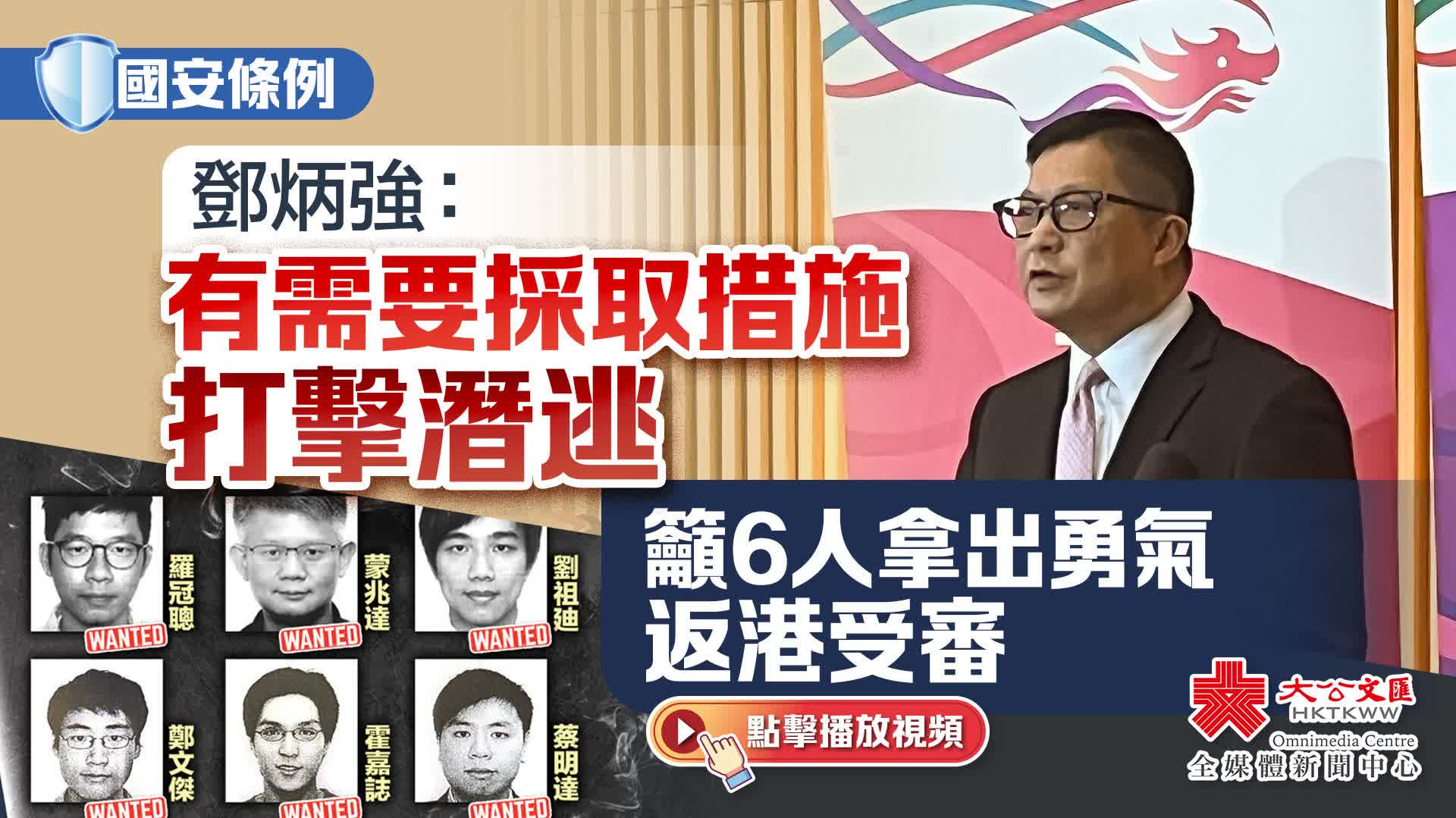 至於其他被通緝人士,鄧炳強表示,保安局會不時檢討情況,在有需要的時候根據法例向指明潛逃者實施相關措施予以打擊。他呼籲市民應避免與該些潛逃者有任何金錢或財務上的瓜葛,切勿與該些危害國家安全的罪犯有任何同流合污情況出現,切勿以身試法。