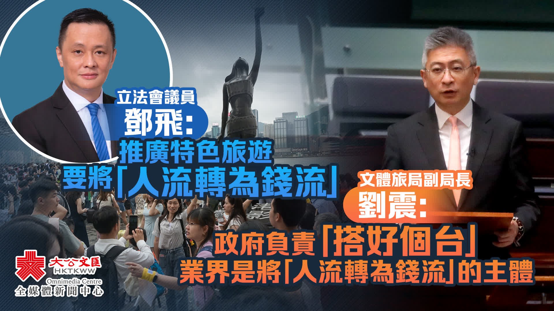 提出質詢的鄧飛留意到,越來越多旅行到油麻地警署打卡,關注政府採取何種措施,將「人流轉為錢流」。劉震表示,政府屬於「搭台」的角色,負責「搭好個台」,業界才是「將人流轉為錢流」的主體。