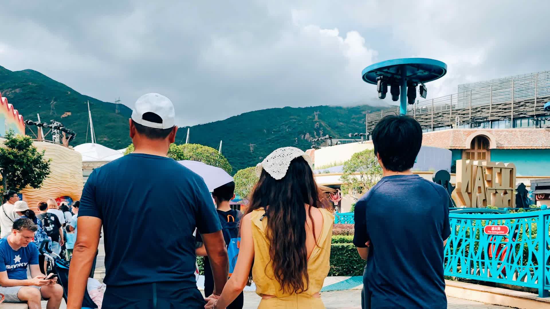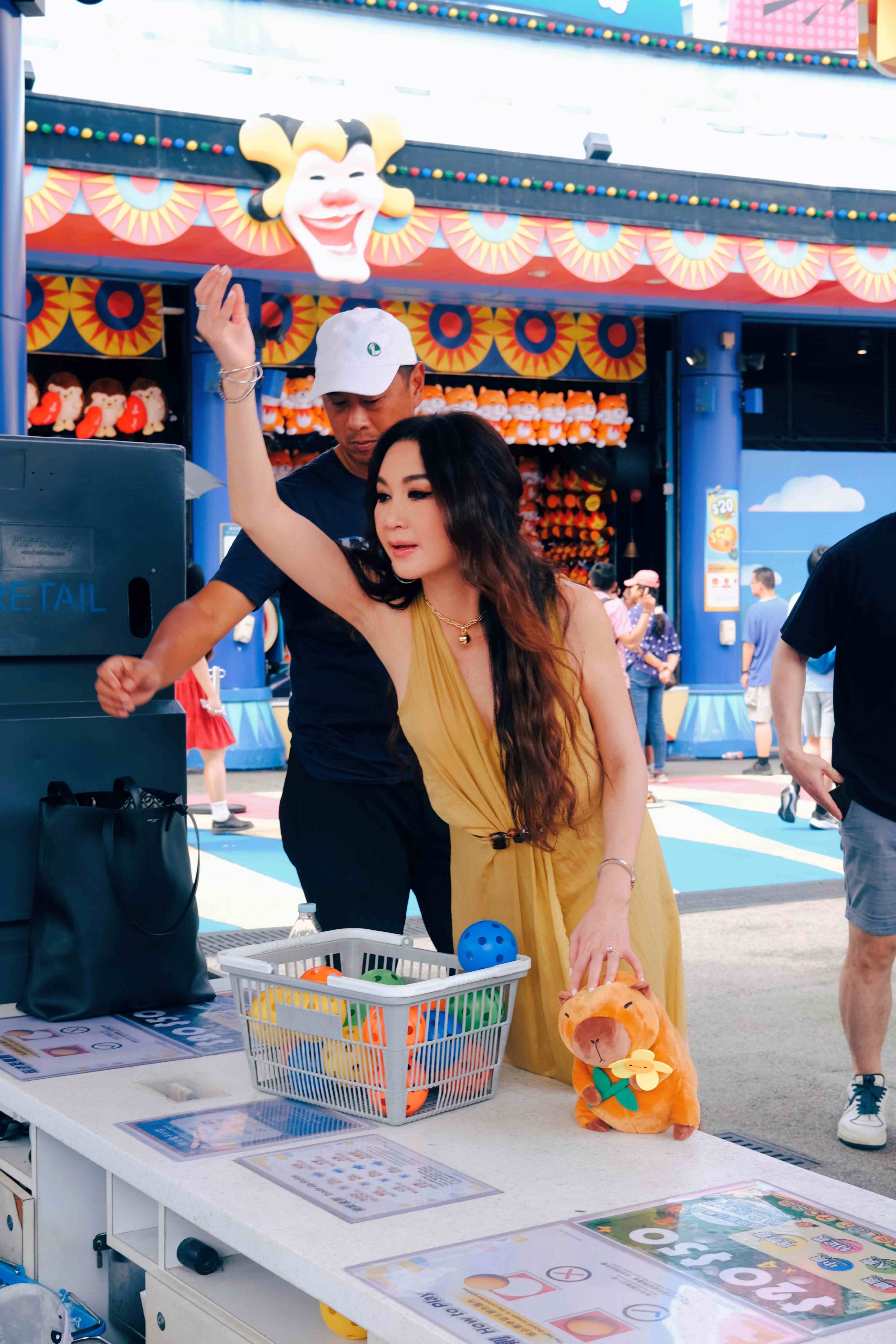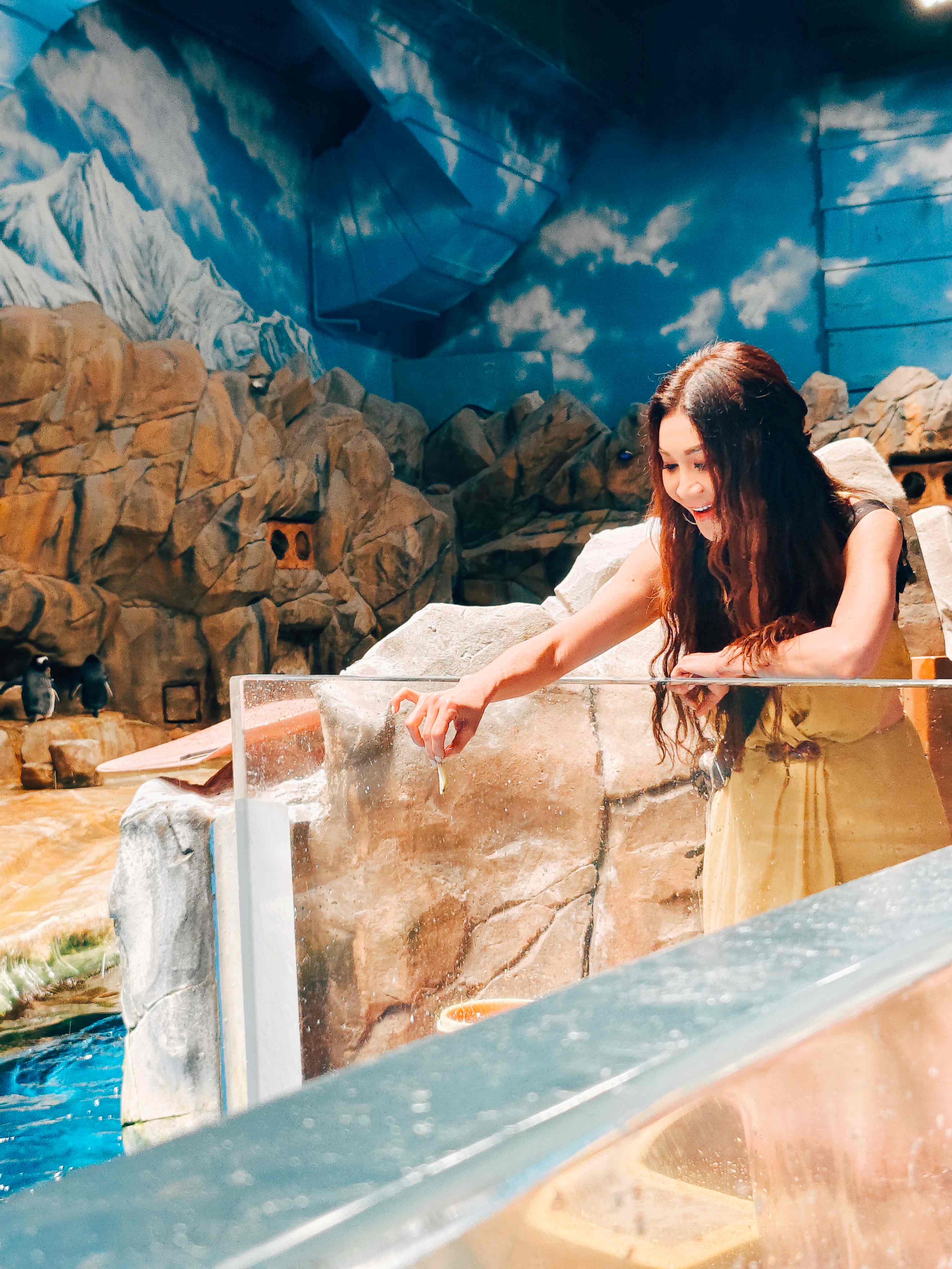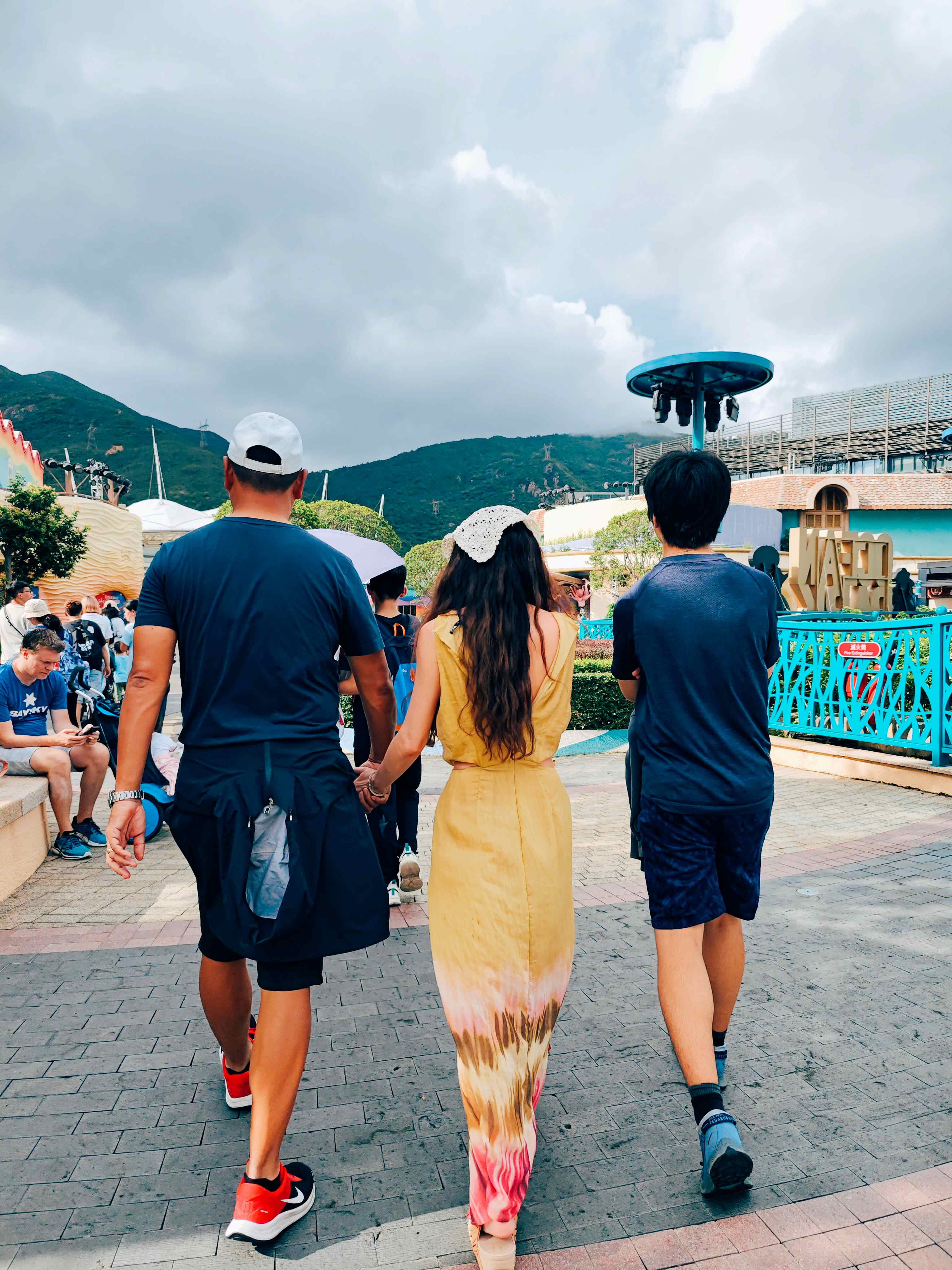 穿上背心低胸露腰長裙的Irene,戴住白色頭巾,一身打扮充滿夏日氣息。相中的Irene親手餵企鵝吃魚仔,又和老公擲公仔,童心未泯,其中一張一家三口溫馨的背影合照,Xavier已經高出Irene大半個頭,身形跟爸爸一樣高大,身旁的Irene顯得十分嬌小。