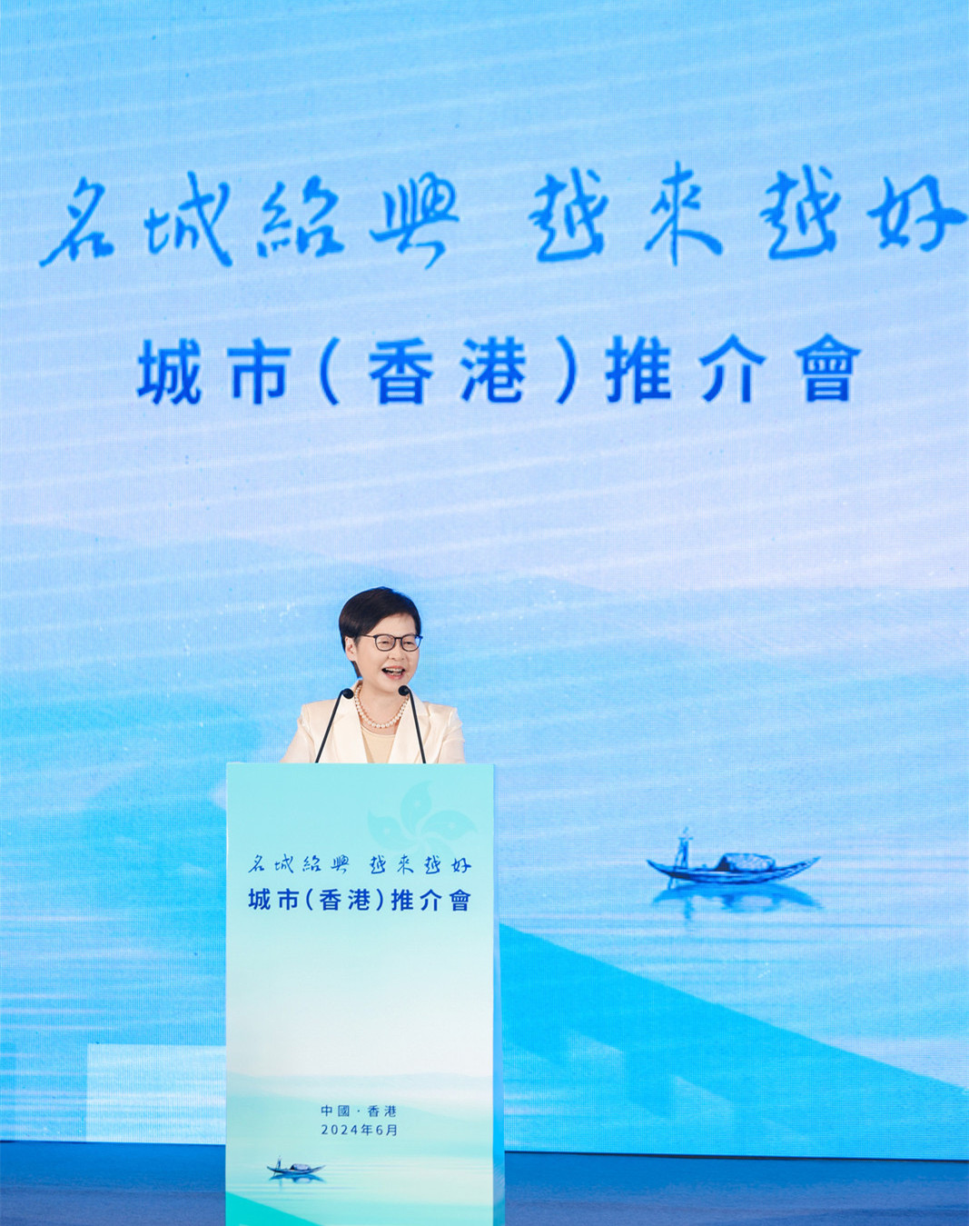 香港特區第五任行政長官林鄭月娥出席推介會並致辭。她毫不掩飾對於紹興這座歷史名城的喜愛,表示每次紹興之行都留下了深刻印象,「最讓我敬佩的是,到目前為止這座2500多年的古城,城市的肌理風貌還是保存的很好。」同時,她指出,未來基於越港兩地地理優勢的基建、運輸、物流等項目合作前景光明。在推動紹興新質生產力發展中,香港還可提供會計、法律、金融等方面的的專業服務。此外,在高校科研合作、人文交流以及兩地青年互動等方面都有着巨大的合作空間。