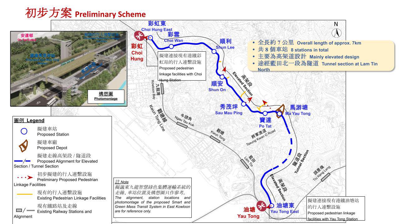 運輸及物流局又說,該智慧綠色集體運輸系統接駁港鐵站,便利市民前往彩虹或油塘站,減少路面交通擠塞;列車採用膠轆行駛,爬升能力比重型鐵路高,適合在上坡地區運行;列車在專屬車道上運行,不受路面交通狀況影響,預計由寶達前往油塘或彩虹地區的車程約10至15分鐘,每程可節省約一半時間;列車系統不需要架空電纜等設施,加上機電支援系統及維修保養工程相對簡單,較具成本效益。