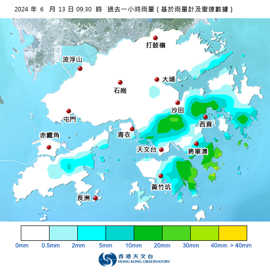 大公文匯全媒體報道,本港今早(13日)濕熱落雨,部分地區錄得超過10毫米雨量。天文台上午9時35分發出特別天氣提示指,與西南氣流相關的雷雨正影響廣東沿岸,初時本港部分地區雨勢較大,提醒市民留意天氣變化。