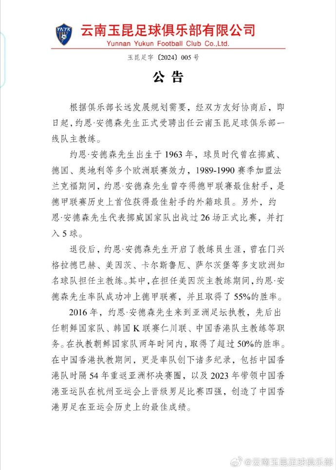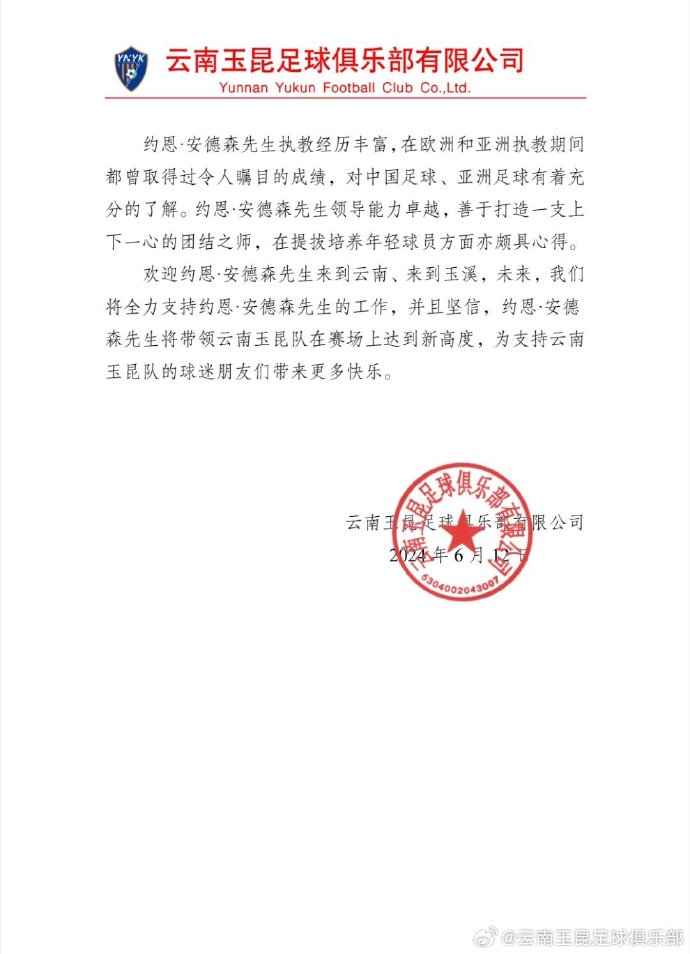 雲南玉昆發文表示,「即日起,約恩·安德森(安達臣)先生正式受聘出任雲南玉昆足球俱樂部一線隊主教練。歡迎約恩·安德森先生來到雲南,來到玉溪工作生活。我們堅信,約恩·安德森先生將帶領雲南玉昆在賽場上達到新高度,為支持雲南玉昆的球迷朋友們帶來更多快樂。」