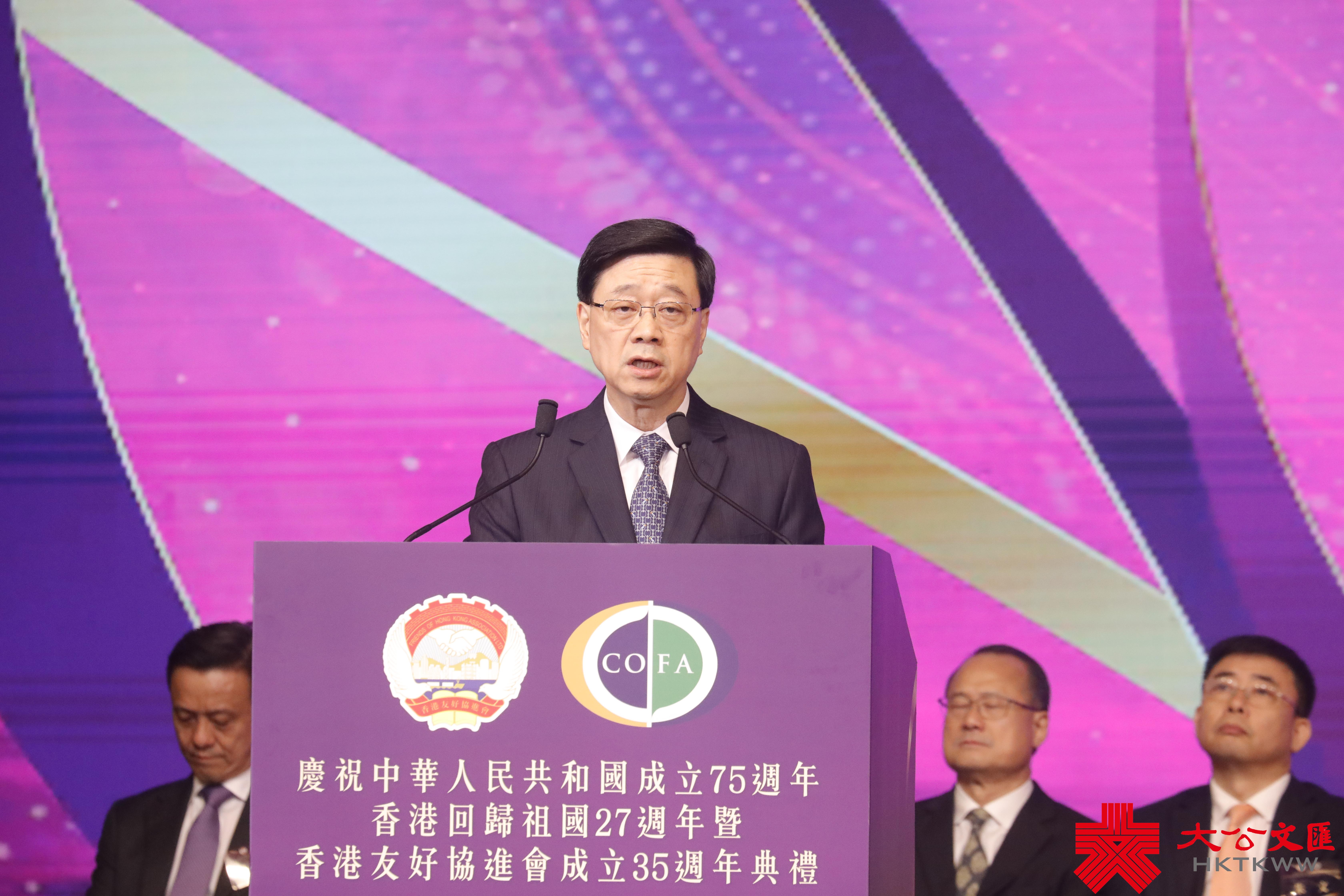 大公文匯全媒體記者報道,「慶祝中華人民共和國成立75周年、香港回歸祖國27周年暨香港友好協進會成立35周年典禮」今晚(13日)在灣仔會展中心隆重舉行,行政長官李家超出席並致辭。李家超表示,香港友好協進會是建設香港的重要力量,是愛國愛港社團的一面旗幟。他感謝香港友好協進會不忘初心、一如既往,積極團結各界支持政府依法施政,促進香港與內地交流合作。為推動國家發展貢獻、為維持香港繁榮穩定貢獻,成績有目共睹。