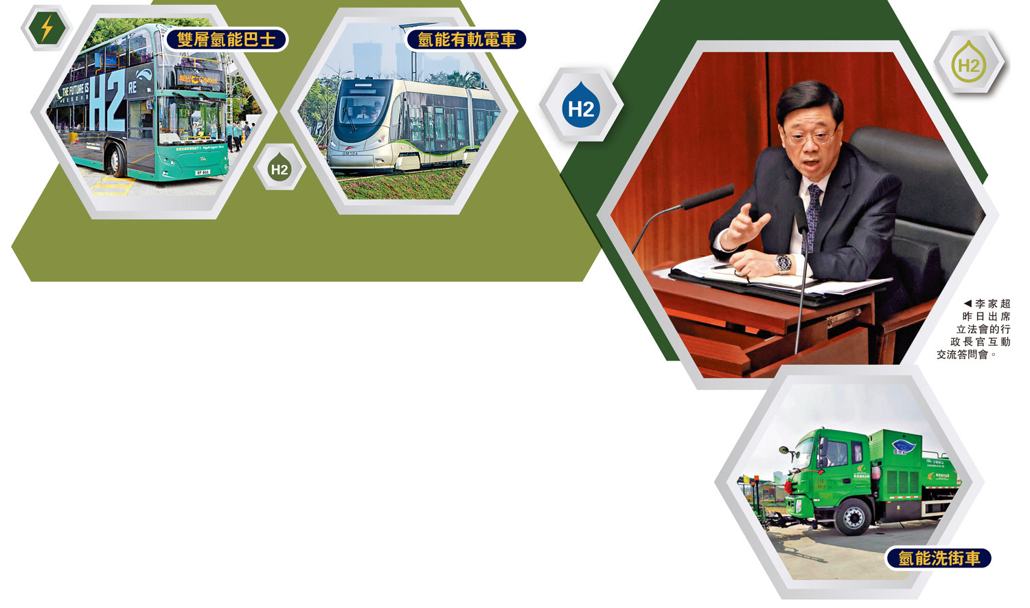 李家超指出,香港有很多優勢和空間推動新質生產力發展,包括氫能、生物製造、創新藥、低空經濟、生命科學等。隨着極端天氣頻繁發生,氫能源被視為有效減少碳排放並且極具發展潛力的新能源,全球各國正在搶佔發展先機。去年施政報告提出將制訂《香港氫能發展策略》,李家超昨天透露,環境及生態局將於本月17日發表氫能發展策略,計劃在今年推出氫能洗街車,亦會考慮引入氫能垃圾車及氫能有軌電車,當局會研究儲存和維修安全指引,可能需要修改氣體安全條例。