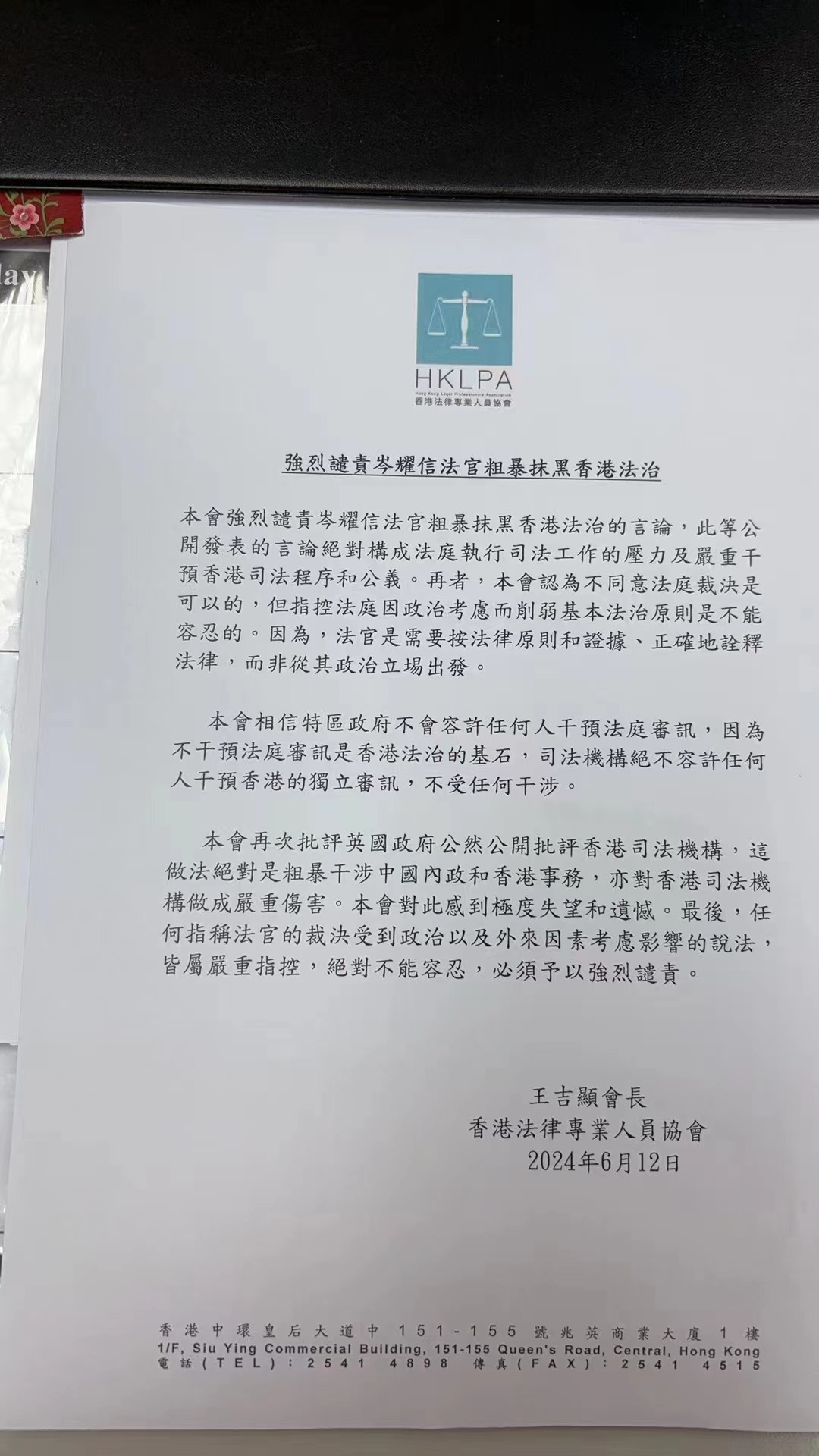 協會再次批評英國政府公然公開批評香港司法機構,這做法絕對是粗暴干涉中國內政和香港事務,亦對香港司法機構造成嚴重傷害。協會對此感到極度失望和遺憾。最後,任何指稱法官的裁決受到政治以及外來因素考慮影響的說法,皆屬嚴重指控,絕對不能容忍,必須予以強烈譴責。