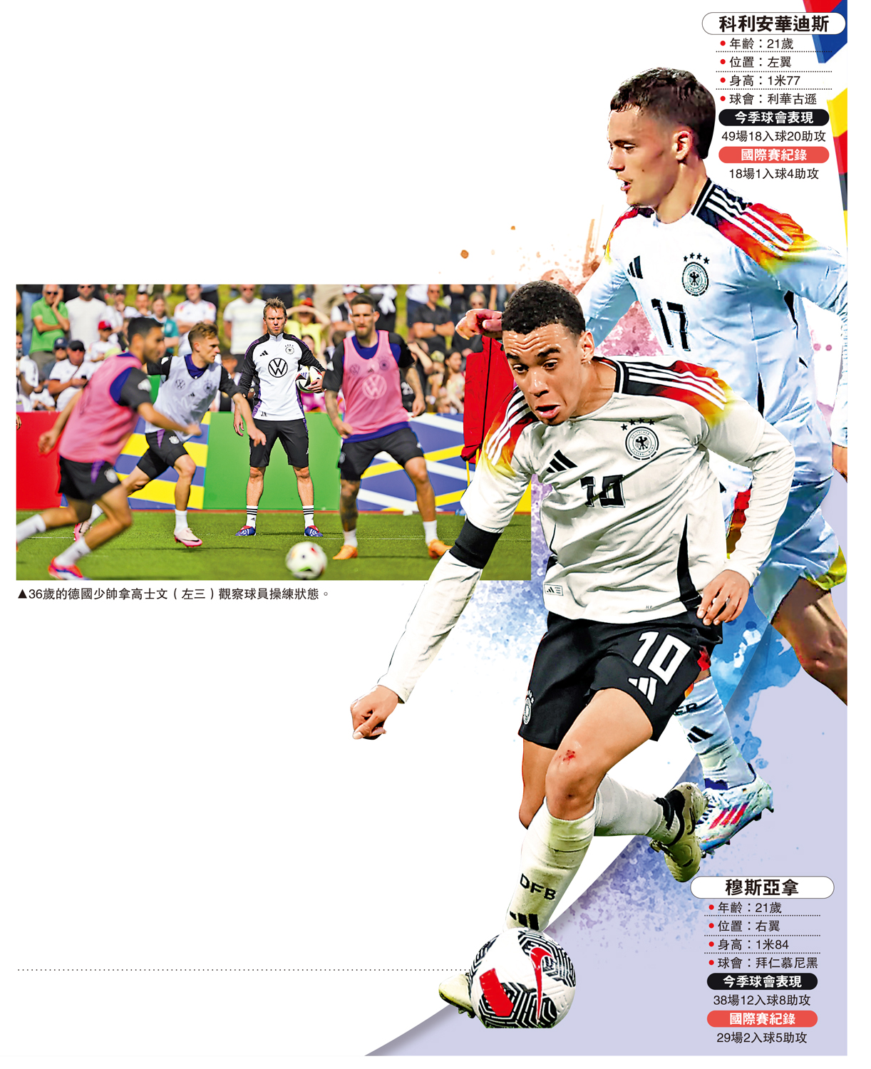 (大公報 記者 譚德龍)歐洲國家盃周六凌晨開鑼,揭幕戰由A組的東道主德國布陣拜仁慕尼黑的安聯球場迎擊蘇格蘭。德國上屆在16強止步,更連續兩屆世界盃恥辱性地未能在分組賽出線,今次換上少帥拿高士文領軍,並以同樣年僅21歲的科利安華迪斯和穆斯亞拿為左右兩翼的進攻重心,配合確立正前鋒新角色的夏維斯,加上安特列治、米圖斯達特和莊拿芬泰希幾位中、後場防守新主力,以煥然一「新」的姿態力圖洗刷過去3次大賽的霉氣。