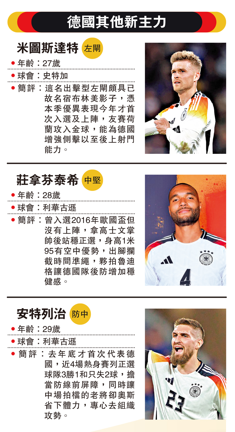 從最近友賽可見,拿高士文的確為德國重塑了運作模式和隊形,首仗遇上倚賴英超「3紅」:利物浦安德魯羅拔臣、曼聯麥湯米尼和阿士東維拉約翰麥甘尼的蘇格蘭,有力旗開得勝。(Viu 99台、NOW618台周六凌晨3時直播)