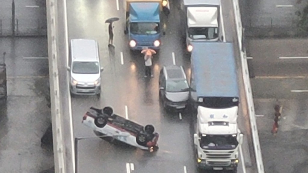大公文匯全媒體報道,本港今日(14日)雨勢頗大,天文台上午一度發出紅色暴雨警告,亦發出新界北部水浸特別報告,其中港鐵荃灣西站附近發生雨水倒灌。約11時13分,紅雨生效期間,荃灣發生三車相撞意外。荃灣路往九龍方向、荃灣體育館對開,一部私家車、一部的士及一部16噸貨車相撞,其中的士更被撞至四輪朝天,幸司機清醒輕傷送院。的士橫亘中、快線間,而16噸貨車則停在慢線。