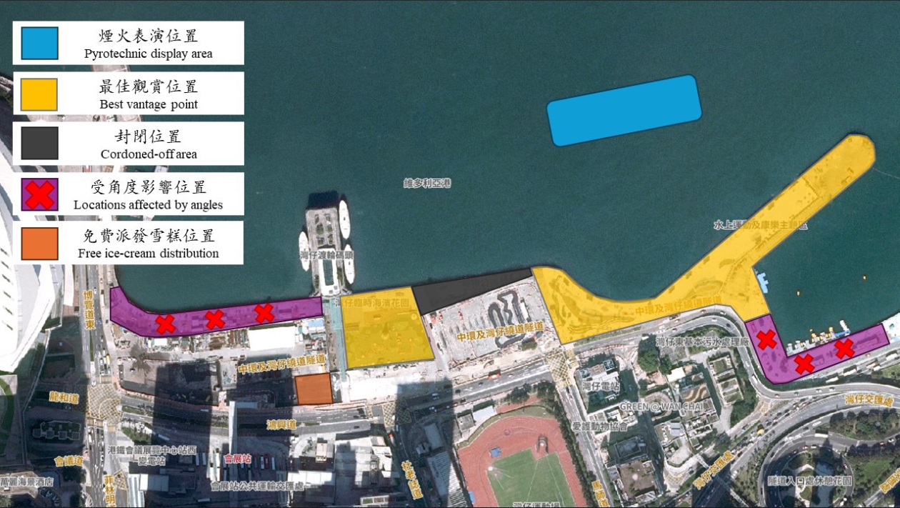 煙火表演的最佳觀賞位置是灣仔HarbourChill海濱休閒站或水上運動及康樂主題區。在表演當天的下午6時至8時,香港旅發局會再度在灣仔海濱免費派發雪糕。數輛雪糕車將在今天下午6點至8點,停泊於灣仔碼頭入口旁免費派發雪糕,每人可獲雪糕一杯,數量有限,派完即止。