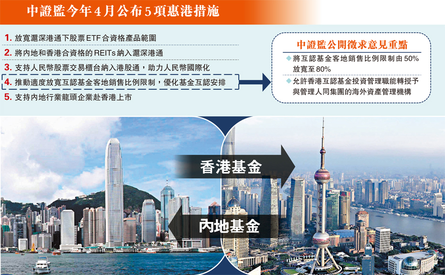 中證監今年4月19日發布5項資本市場對港合作措施,包括放寬滬深港通下股票ETF合資格產品範圍、將REITs納入滬深港通、支持人民幣股票交易櫃台納入港股通、優化基金互認安排和支持內地行業龍頭企業赴香港上市等,以進一步拓展優化滬深港通機制、助力香港鞏固提升國際金融中心地位,共同促進兩地資本市場協同發展。消息公布後,基金界曾希望監管當局落實措施時,考慮回應業界訴求,包括全面取消基金互認安排下客地銷售比例限制等。