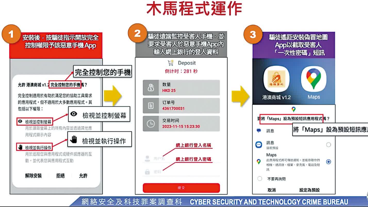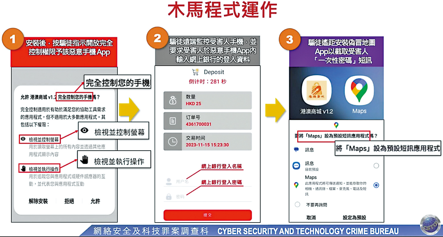 香港警方聯同星馬兩地警方在去年年中留意到有犯罪集團針對香港及新加坡市民進行網購詐騙,集團透過不同社交平台開設虛假商店專頁,指示消費者透過在超連結下載及安裝虛假的網購應用程式,實際上是為了遠端監控市民手機的木馬程式,騙徒藉落訂單騙取消費者網上理財的用戶名稱、密碼和流動理財PIN等資料,從而登入市民的網上理財戶口,再在受騙者手機安裝偽冒成地圖的手機程式以截取網上理財戶口的一次性密碼短訊,登入受害人網上理財戶口,將戶口內存款全數轉賬至傀儡戶口。