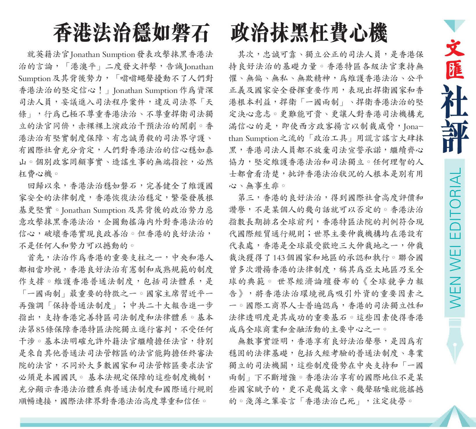 回歸以來,香港法治穩如磐石,完善健全了維護國家安全的法律制度,香港恢復法治穩定,繁榮發展根基更堅實。Jonathan Sumption及其背後的政治勢力惡意攻擊抹黑香港法治,企圖動搖海內外對香港法治的信心,破壞香港實現良政善治。但香港的良好法治,不是任何人和勢力可以撼動的。