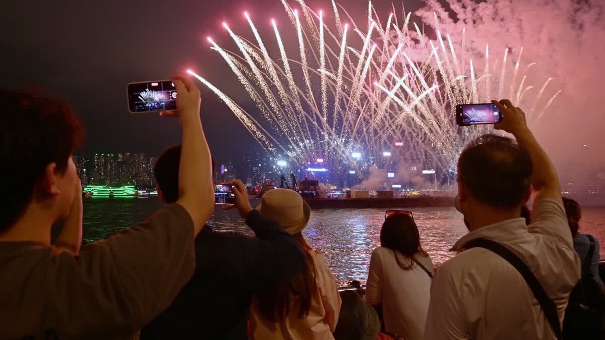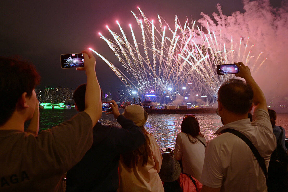 在灣仔海濱,今晚8點將整準時上演海上煙火。屆時,絢爛的煙火將在夜空中繪製出別具一格的「笑臉」及「HK」圖案。而在表演正式開始前,觀眾還將在晚上7時30分及7時45分欣賞到迷你煙火。