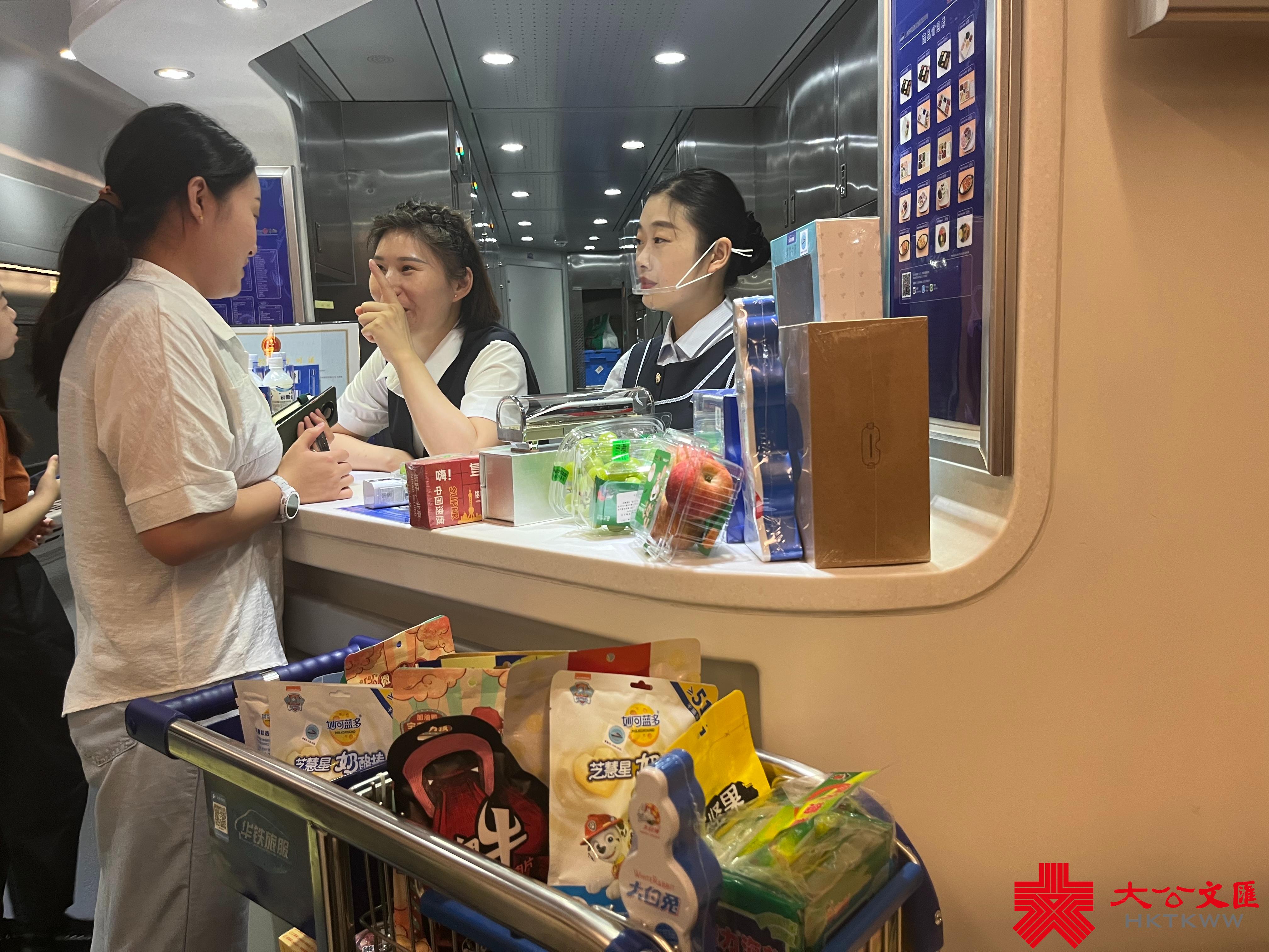 列車的9號車廂為餐車,售賣晚飯和零食,亦可在此就餐。列車亦為每名乘客贈送一盒輕食,輕食包含兩種,一種為香港特色零食,另一種則是上海特色小吃,至於收到哪種就由乘客自己親身「開盲盒」了。
