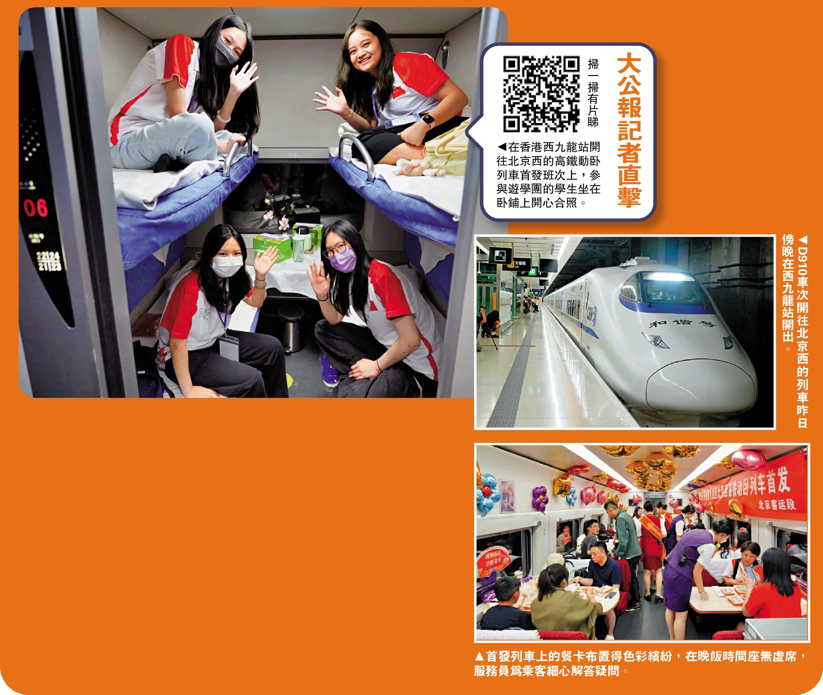 (大公報 記者 李清、方俊明、伍軒沛、方俊明)「十分興奮!」「迫不及待想要體驗!」6月15日晚,香港西九龍站至北京西站、上海虹橋站的夕發朝至高鐵動卧列車正式開通。搭載着滿車體驗高鐵新服務的旅客,開啟了香港京滬間夕發朝至,雙向而行的新旅程,令兩地聯繫更密切。同日早上,許多香港旅客已從西九龍站乘坐首列增開往張家界西站的高鐵列車,展開了湖南之旅。