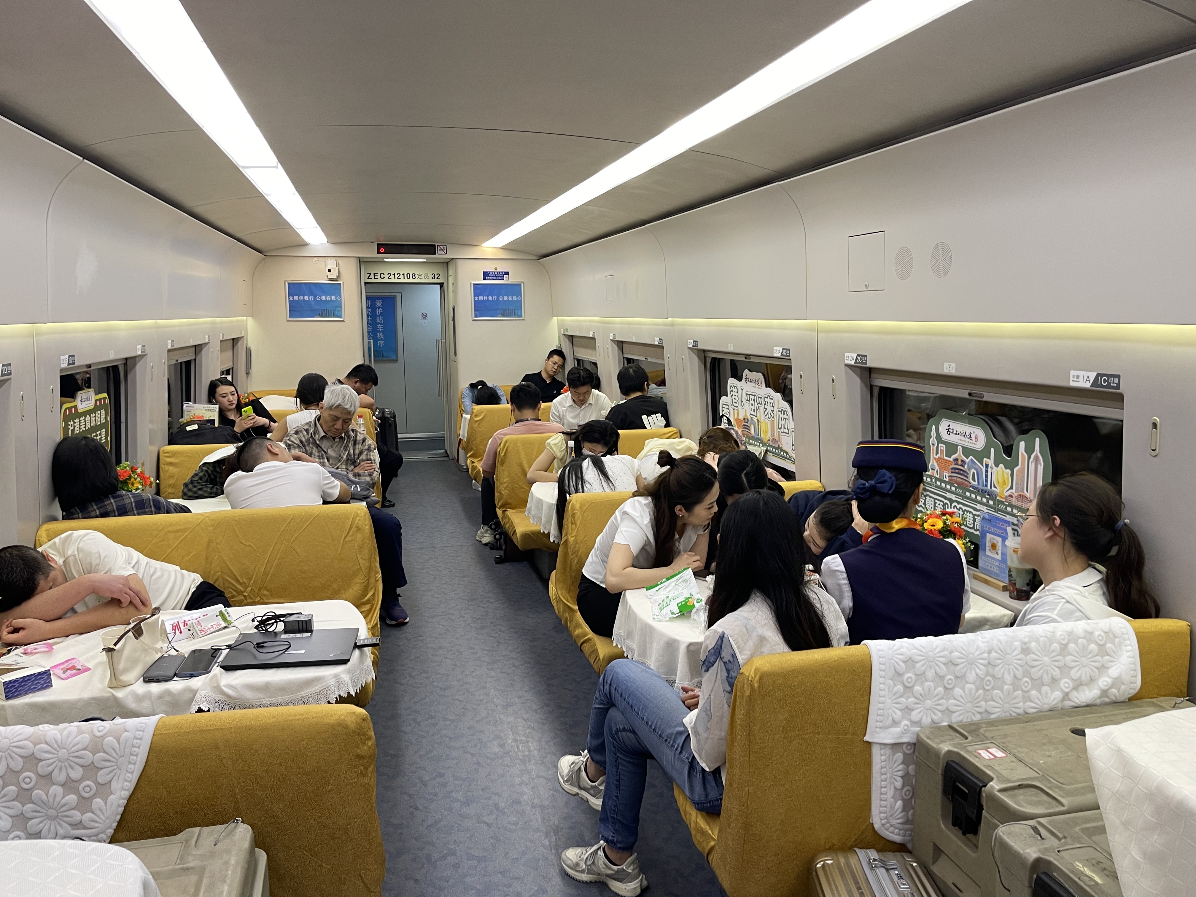 雖然很多人都有乘坐臥鋪列車的經歷,但首次體驗「睡一晚就到香港」,還是讓不少乘客興奮到無眠。15日晚間列車發車後,大家或坐在車廂內聊天,或欣賞着車窗外的風景,也有前往餐車體驗了一把舌尖上的滬港列車。記者在車廂內看到,為了滿足不同乘客的需求,列車員們都在各自崗位嚴陣以待,無論是車廂衞生還是旅客安全,都會定時檢查,確保萬無一失。