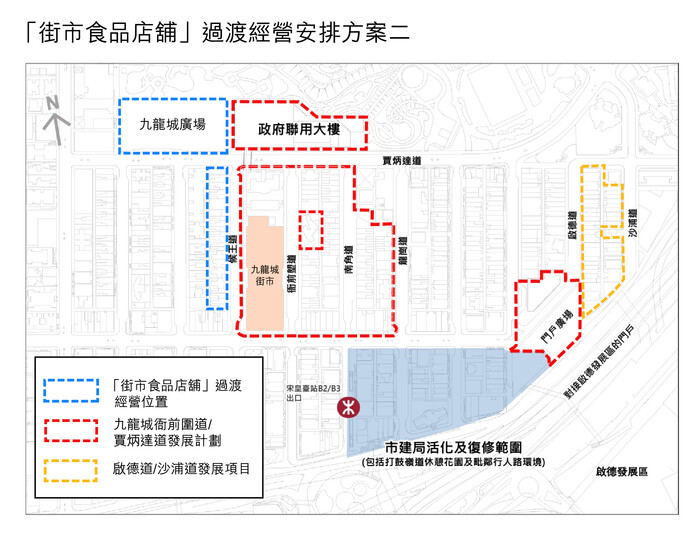 市建局團隊研究過渡經營安排的選址和配套及回遷安排的支援,將預留面向衙前塱道和南角道部分臨街地舖,供「街市食品店舖」營運者在過渡期間經營,配合營運者希望集中在街市附近一帶繼續經營的意願,並方便市民「幫襯」。若營運者選擇遷至面向侯王道、賈炳達道或九龍城廣場內的店舖,市建局會為他們提供額外的支援。至於回遷安排,衙前圍道項目已預留部分商舖供「街市食品店舖」的營運者優先租用,並提供特惠租金,為期5年。