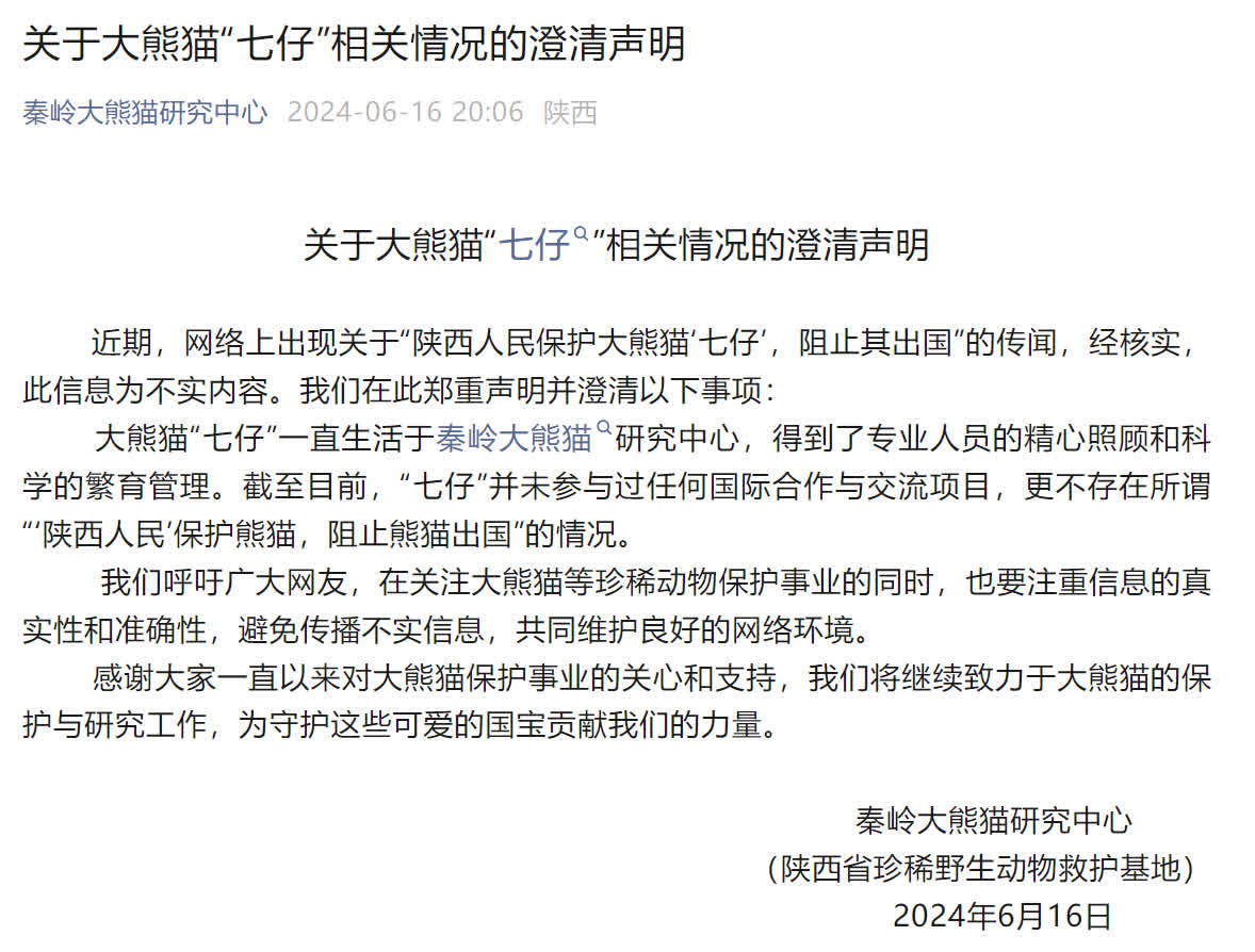 大公文匯網報道,近期,網絡上出現關於「陝西人民保護大熊貓『七仔』,阻止其出國」的傳聞。6月16日,秦嶺大熊貓研究中心(中心)發布聲明表示,經核實,此信息為不實內容。