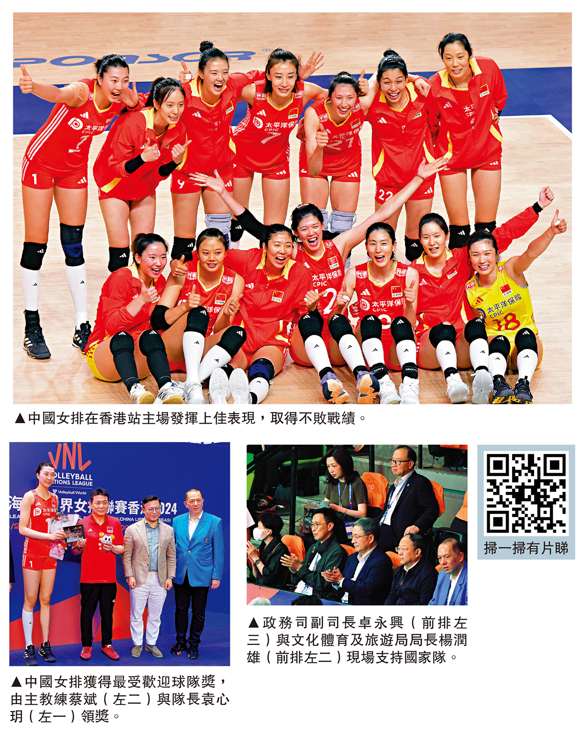 首次在香港觀看排球比賽,現場氣氛很好,大家都為國家隊打氣,很讓人感動。對於巴黎奧運,中國女排只要正常發揮,應可獲得獎牌。