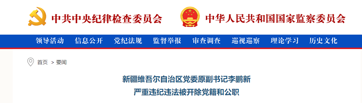 據中央紀委國家監委網站消息,經中共中央批准,中央紀委國家監委對新疆維吾爾自治區黨委原副書記李鵬新嚴重違紀違法問題進行了立案審查調查。