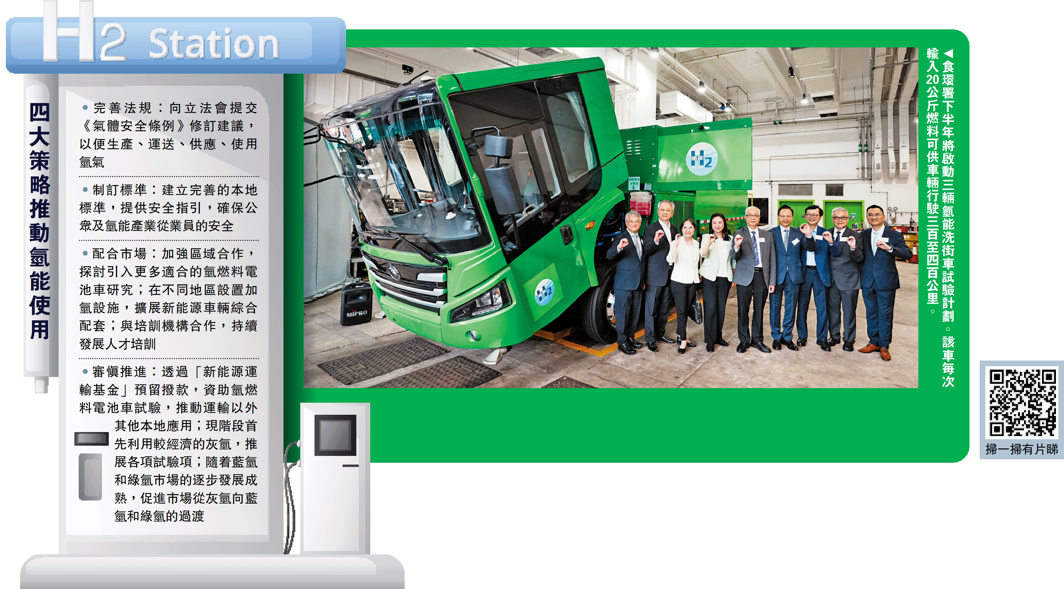 謝展寰表示,氫能已被視為具發展潛力的低碳能源,世界各國正全力推進氫能產業發展,政府在2022年,已成立由十多個政策局及專業部門組成的「氫能源跨部門工作小組」,為啟動本地氫能應用拆牆鬆綁,至今已原則上同意十四個試驗項目,包括跨境運氫、供氫設施、交通、工地及偏遠地區應用等,例如城巴一輛氫能巴士,已在今二月底投入運作。