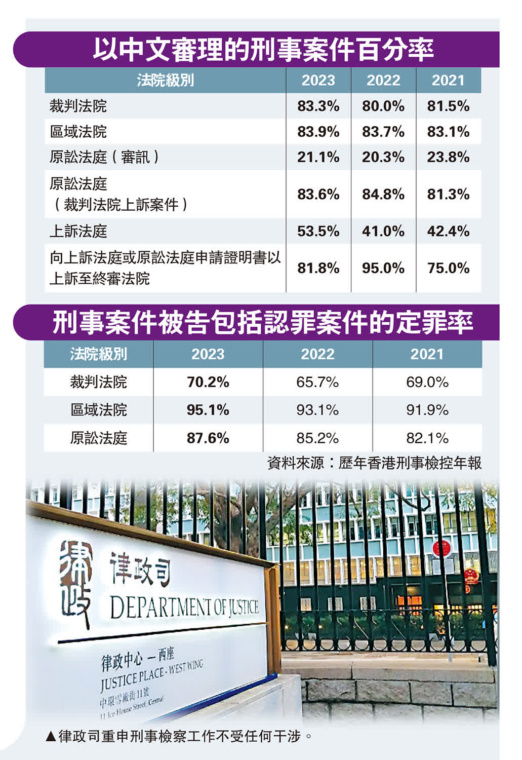 (大公報 記者 龔學鳴)律政司刑事檢控科昨日發表其年報《香港刑事檢控2023》,回顧律政司2023年的檢控工作。政府重申,律政司的所有檢控決定均是按法律、證據和《檢控守則》作出。檢控人員不會考慮亦不會受任何不相關的因素影響,例如政治或個人利益、媒體或公眾對決定可能產生的反應,以及檢控人員的個人感受或信念。