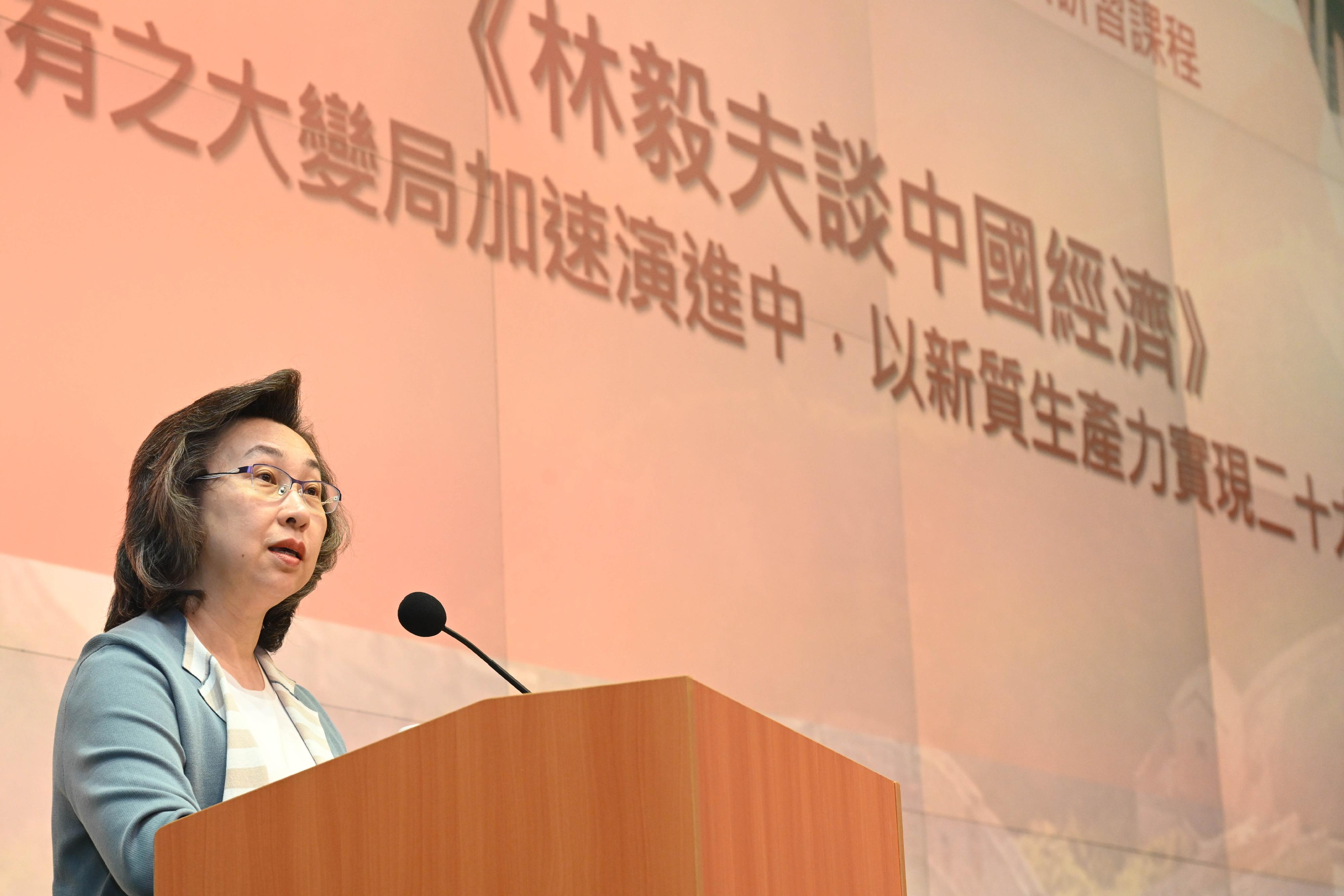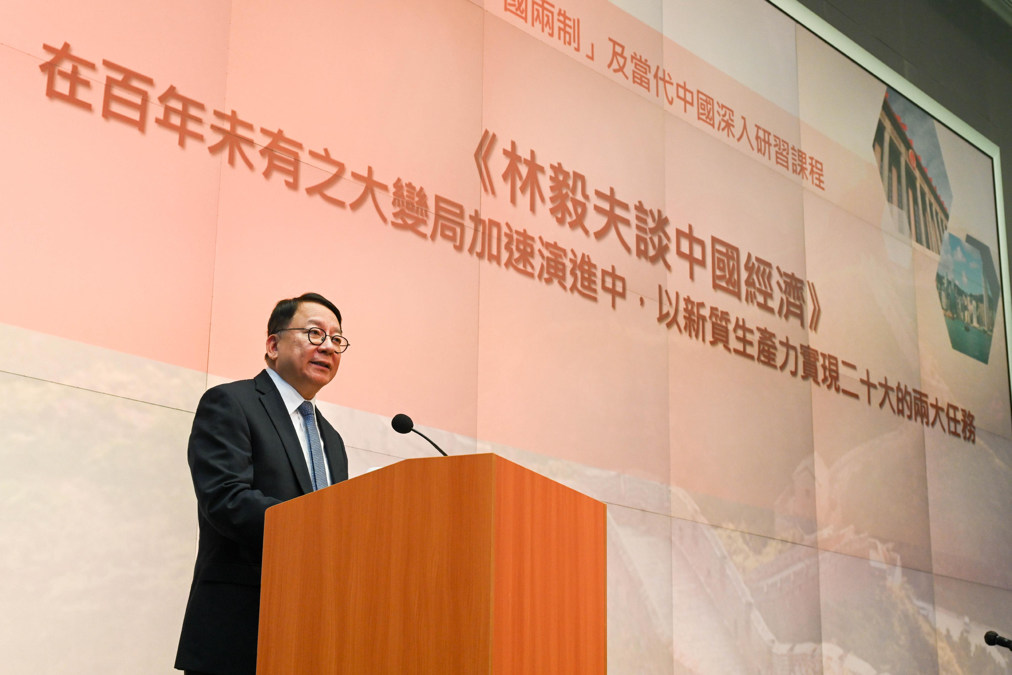 政務司司長陳國基在講座致辭時表示,發展新質生產力與香港更好融入國家發展大局息息相關,而國家今年的政府工作報告明確將「大力推進現代化產業體系建設,加快發展新質生產力」作為首要任務,並就國家不同領域的工作提出全面部署,為香港在中國式現代化與高質量發展的新征程上展現新擔當、實現新作為,提供明確指引。他又勉勵出席同事,透過是次講座思考如何更好鞏固提升香港在「一國兩制」下背靠祖國、聯通世界的顯著優勢,以及「八大中心」的策略地位,更好發揮香港所長,服務國家所需。