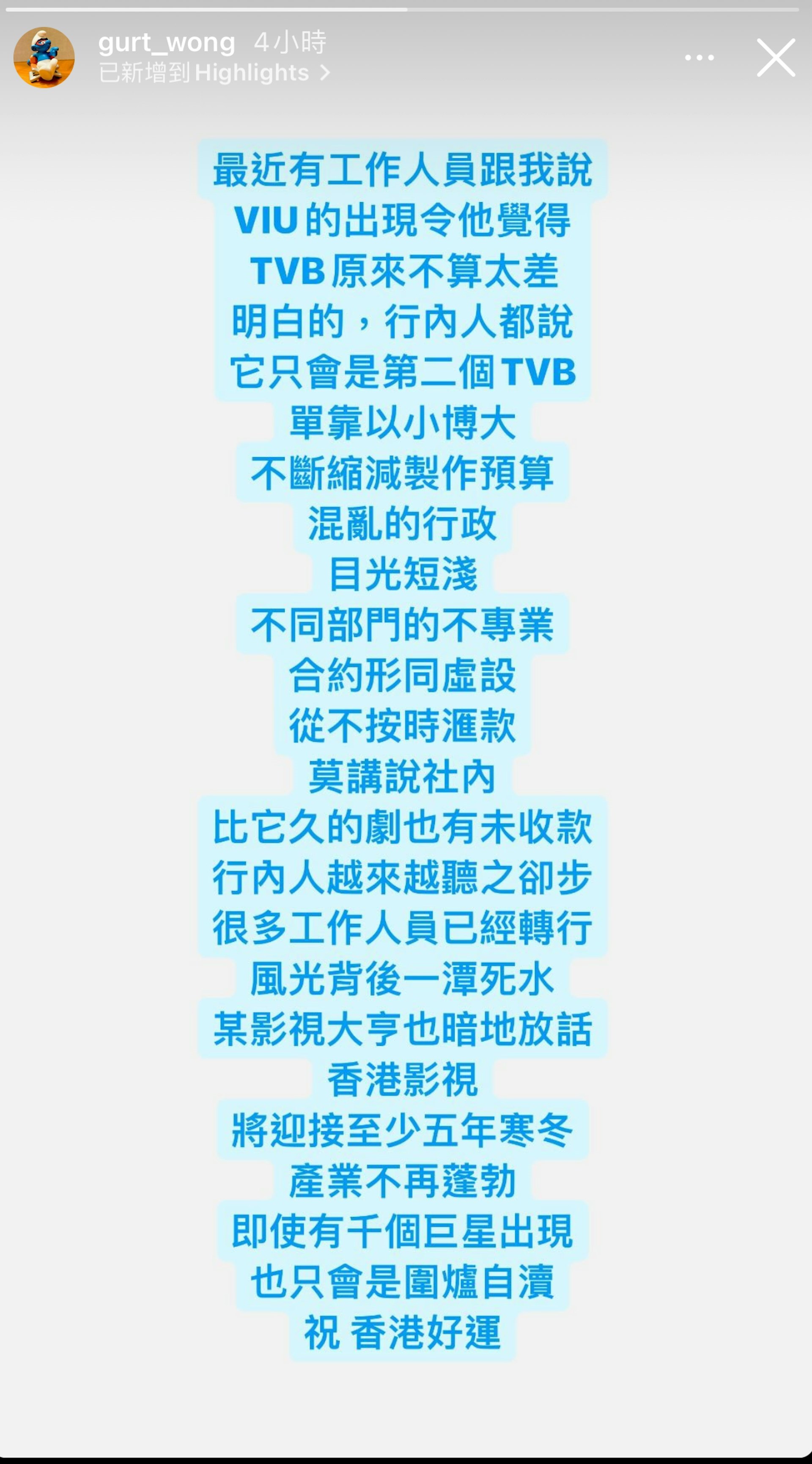 黃汝樂並有感而發寫道:「最近有工作人員跟我說,Viu的出現令他覺得TVB原來不算太差。明白的,行內人都說它只會是第二個TVB,單靠以小博大,不斷縮減製作預算,混亂的行政、目光短淺、不同部門的不專業、合約形同虛設、從不按時滙款。」