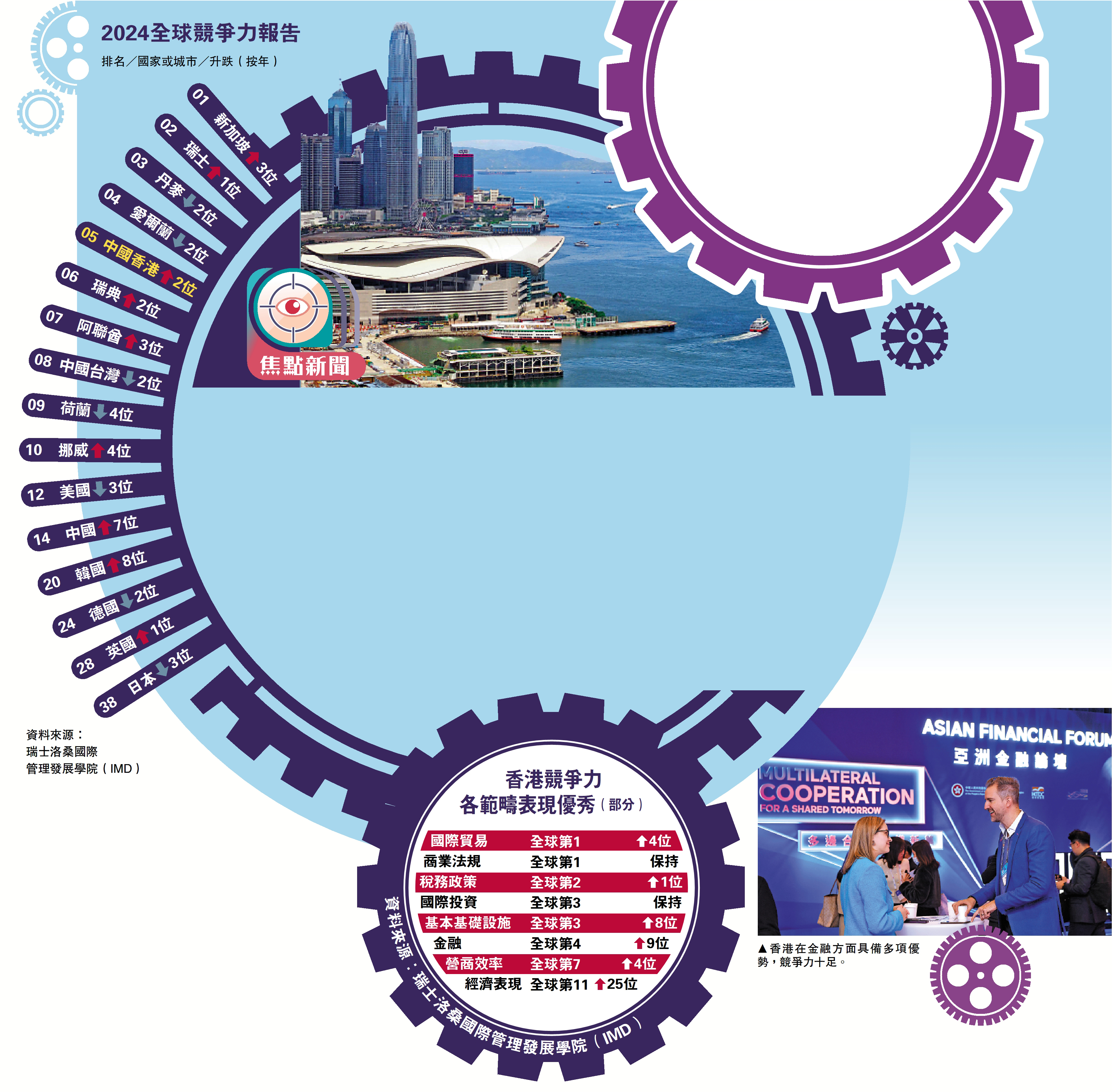 (大公報 記者 賴振雄、鍾佩欣、彭子河)香港集中精力「拚經濟、拚發展」,優勢顯著。瑞士洛桑國際管理發展學院(IMD)昨日發表2024全球競爭力報告,香港全球排名第五,較去年上升兩位,重返世界五強,四個競爭力因素之中,「經濟表現」排名大幅改善,反映2023年的經濟復甦。