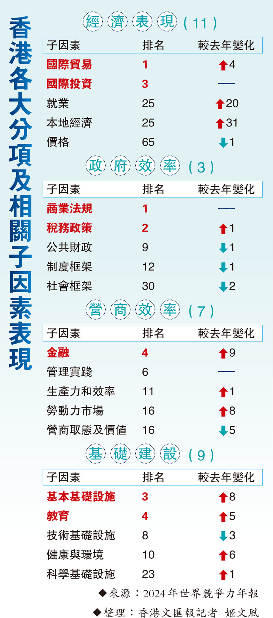 (香港文匯報 記者 姬文風)瑞士洛桑國際管理發展學院(IMD)昨日最新發布《2024年世界競爭力年報》,香港排名上升兩位至全球第五,緊隨新加坡、瑞士、丹麥、愛爾蘭之後。細看各項排名因素,香港在「國際貿易」和「商業法規」排名全球第一,在「稅務政策」、「國際投資」、「基本基礎設施」、「金融」及「教育」亦位列全球前五名。特區政府發言人昨日回應排名時指,在中央堅實支持下,香港經濟自疫情後持續恢復,特區政府的多項措施堅定了市場信心並吸引世界各地的企業、資金和人才來港,強調香港將會繼續發揮好「超級聯繫人」和「超級增值人」的角色和功能,積極融入國家發展大局,對接好國家發展策略,持續擴大經濟容量、培育新增長點和提升競爭力,讓經濟發展攀上更高的台階,為市民和企業創造更多、更好的發展機會。