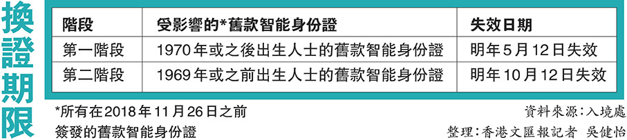 (香港文匯報 記者 吳健怡、郭木又)現時香港仍有18.2萬人未換領新的智能身份證,特區政府入境事務處昨日宣布,舊款的智能身份證將分兩階段失效:1970年或之後出生人士,其舊款智能身份證將於明年5月12日起失效;1969年或之前出生入士,其舊證將於明年10月12日失效。入境處副處長戴志源呼籲未換證的市民,把握時間盡快申領新證。他強調,舊證失效不影響持有人的居留權,如因身在外地而未能在指定期限內換證不會違法,但返港後30天內必須換領,否則即屬違法。有回港探親的市民昨日申請換證,她認為預約過程順利、快速。