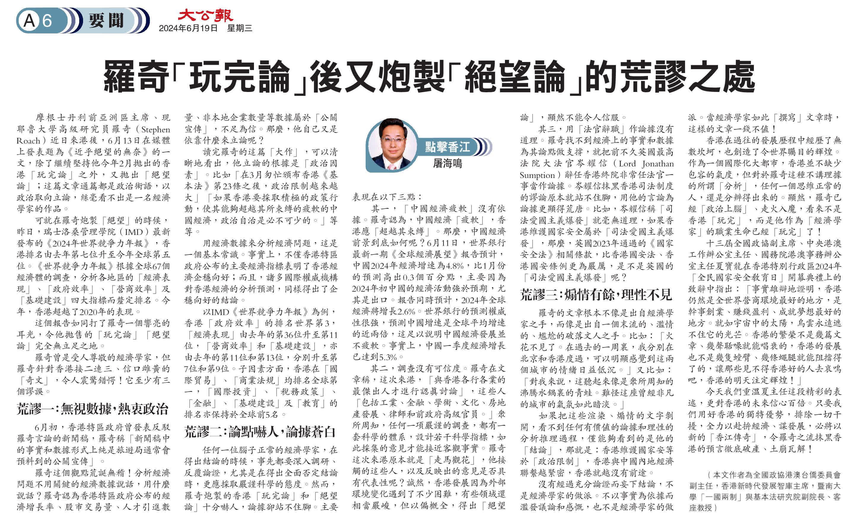 摩根士丹利前亞洲區主席、現耶魯大學高級研究員羅奇(Stephen Roach)近日來港後,6月13日在媒體上發表題為《近乎絕望的無奈》的一文,除了繼續堅持他今年2月拋出的香港「玩完論」之外,又拋出「絕望論」;這篇文章通篇都是政治術語,以政治取向立論,絲毫看不出是一名經濟學家的作品。
