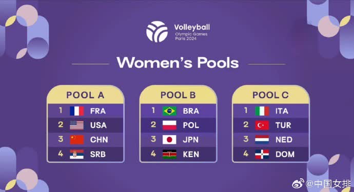 據中國女排微博消息,2024年巴黎奧運會女排分組,中國女排被分到了A組,同組還有東道主法國女排,衛冕冠軍東京奧運會冠軍美國女排、歐洲勁旅塞爾維亞女排。