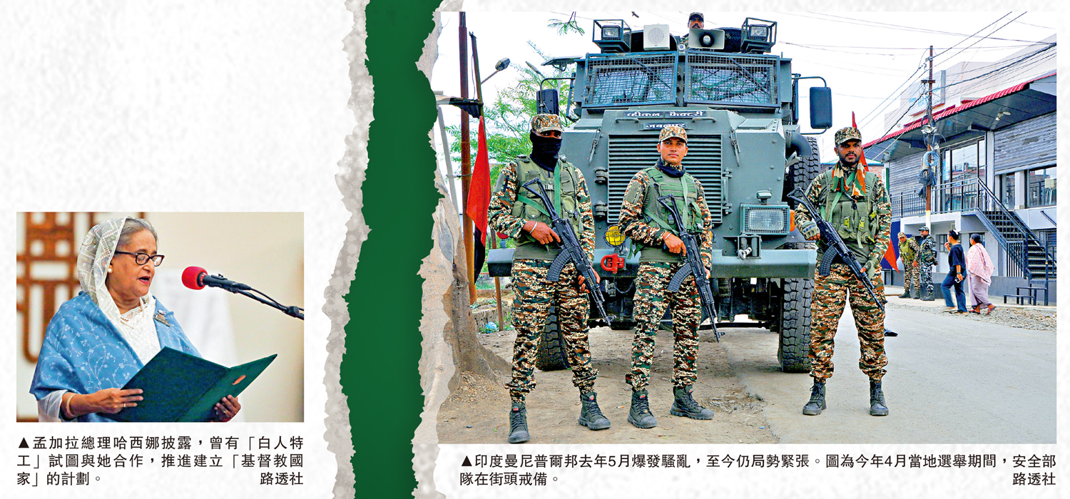 今年年初上任的孟加拉總理哈西娜披露,一名「白人特工」曾在選舉前找到她,提出幫助她「輕鬆贏得選舉」,條件是允許這名特工代表的國家在孟加拉建立軍事基地。哈西娜說,這一提議是某個外國勢力在孟加拉和緬甸部分地區建立一個「基督教國家」計劃的一部分。印度媒體表示,這個「建國計劃」的幕後黑手很可能是美國中央情報局(CIA),且美國盯上的土地還包括印度東北部。美國圖謀煽動上述地區信仰基督教的欽族和庫基族居民發起獨立運動,再將新建立的基督教國家當作在南亞和東南亞增強影響力的戰略立足點。