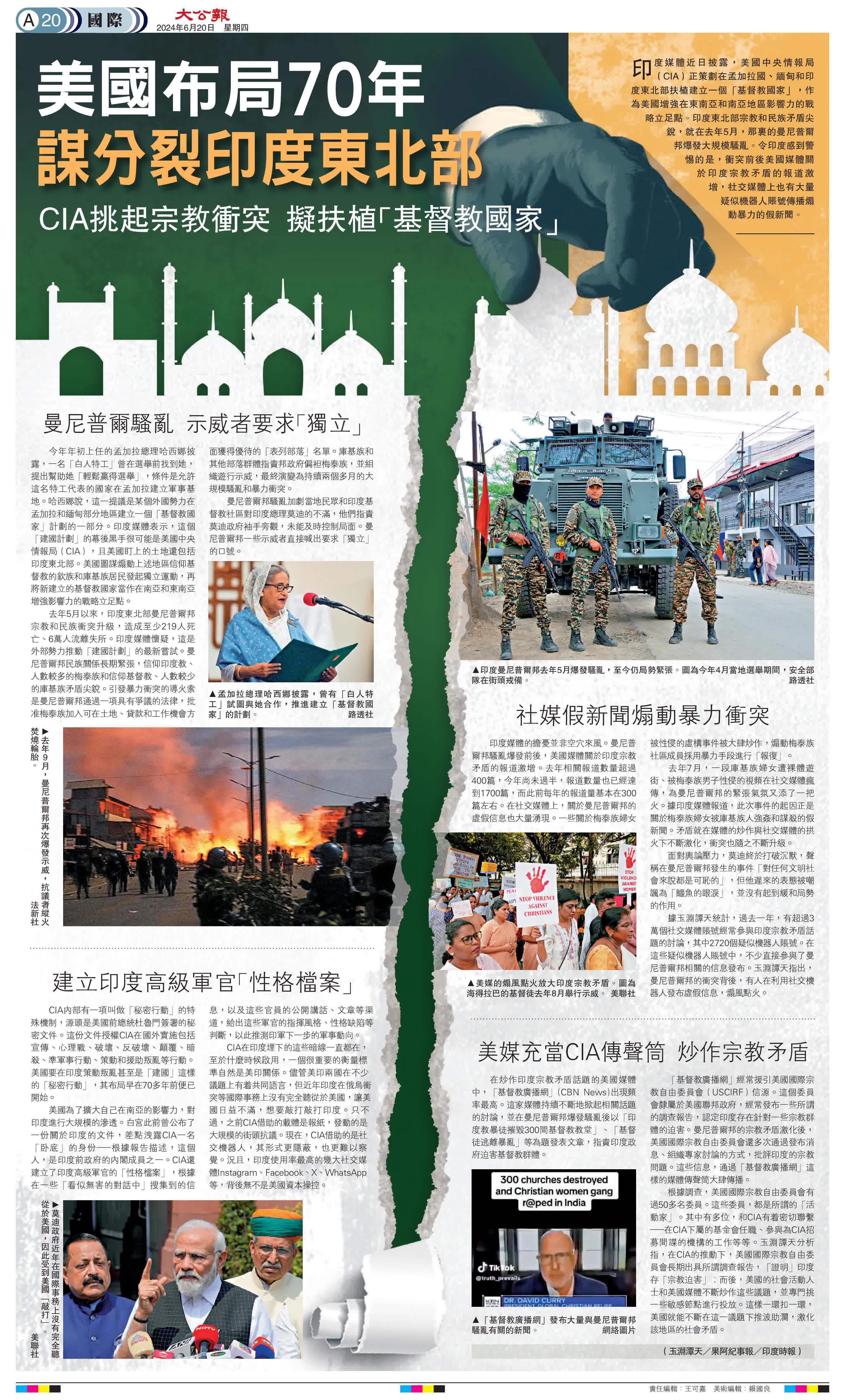 據大公報綜合報道,印度媒體近日披露,美國中央情報局(CIA)正策劃在孟加拉國、緬甸和印度東北部扶植建立一個「基督教國家」,作為美國增強在東南亞和南亞地區影響力的戰略立足點。印度東北部宗教和民族矛盾尖銳,就在去年5月,那裏的曼尼普爾邦爆發大規模騷亂。令印度感到警惕的是,衝突前後美國媒體關於印度宗教矛盾的報道激增,社交媒體上也有大量疑似機器人賬號傳播煽動暴力的假新聞。