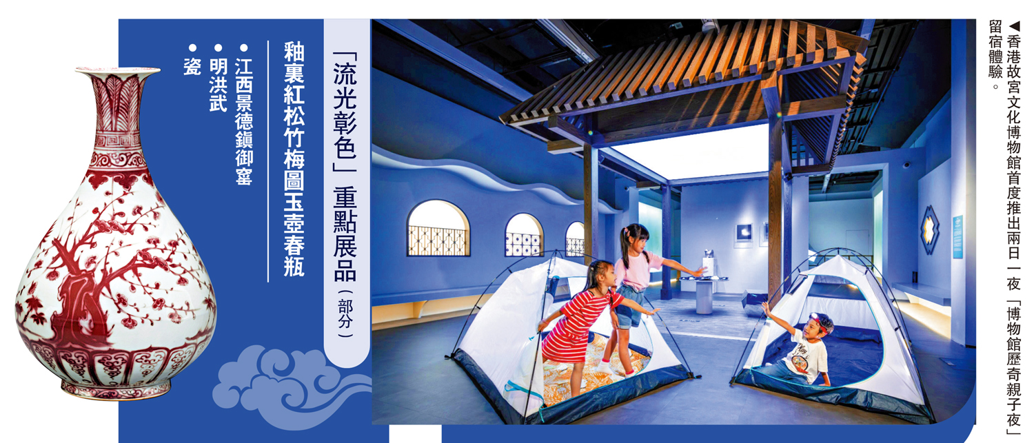此外,香港故宮文化博物館與故宮博物院合辦全新專題展覽「流光彰色──故宮博物院藏明代陶瓷珍品」,是繼開幕展後第二個大型故宮博物院陶瓷展。明代是中國陶瓷發展史上最鼎盛的時期之一,瓷器品質精良,呈現出多姿多彩的面貌。展覽展出逾百件珍品,不僅是中國陶瓷藝術登峰造極之作,也是明代歷史、科技發展,以及文化交流的縮影。展覽按時序分為三個單元,分別展出明代早、中、晚期名品,彰顯明代陶瓷工藝的發展演變和傑出成就。今次亮相的故宮博物院珍寶全是首度來港展出,當中國家一級文物共21件,包括洪武釉裏紅松竹梅圖玉壺春瓶、宣德青花礬紅彩海水龍紋盤、成化款鬥彩三秋杯及萬曆款五彩花鳥圖蒜頭瓶等。